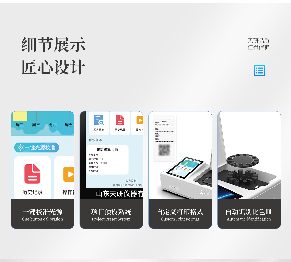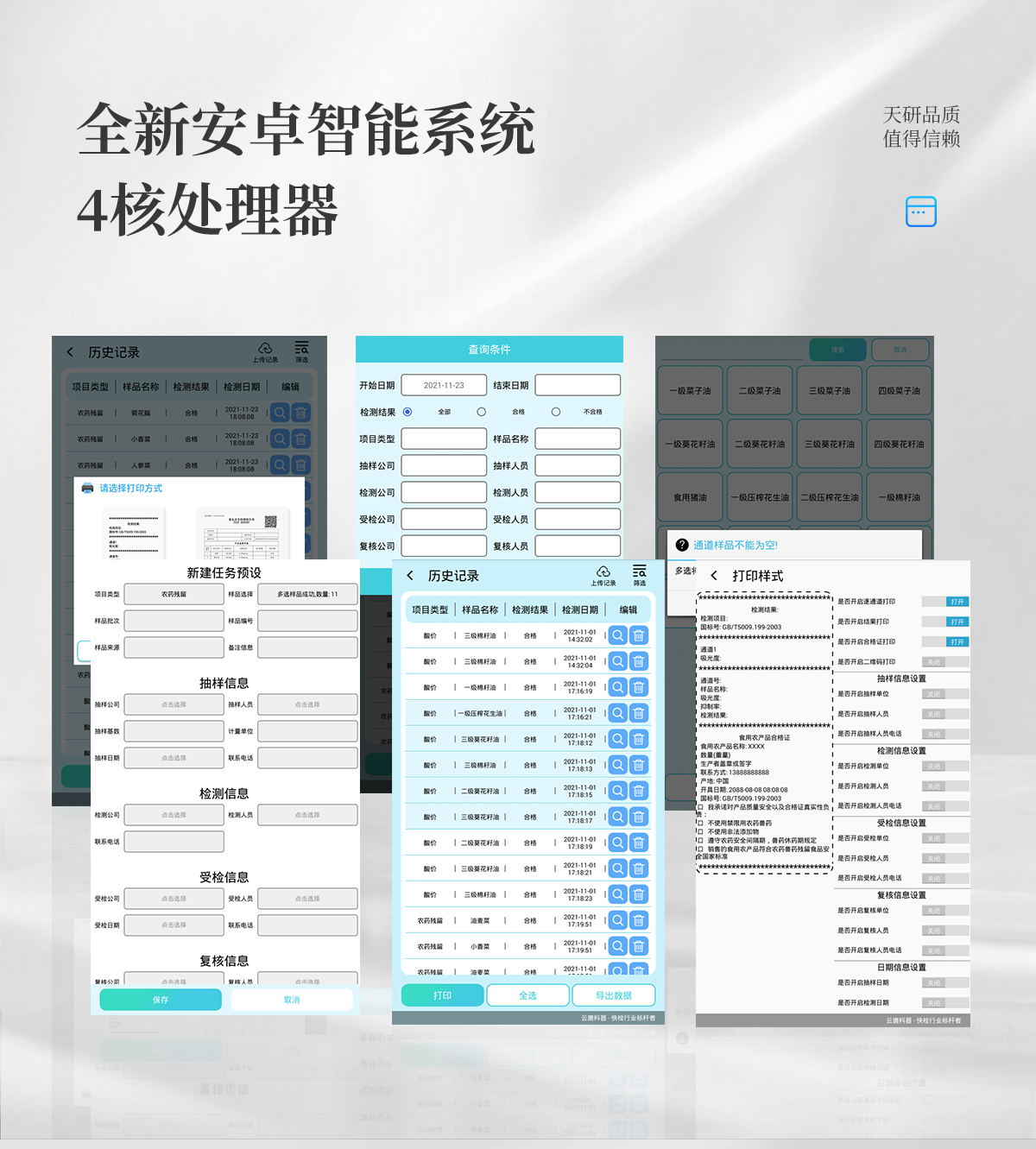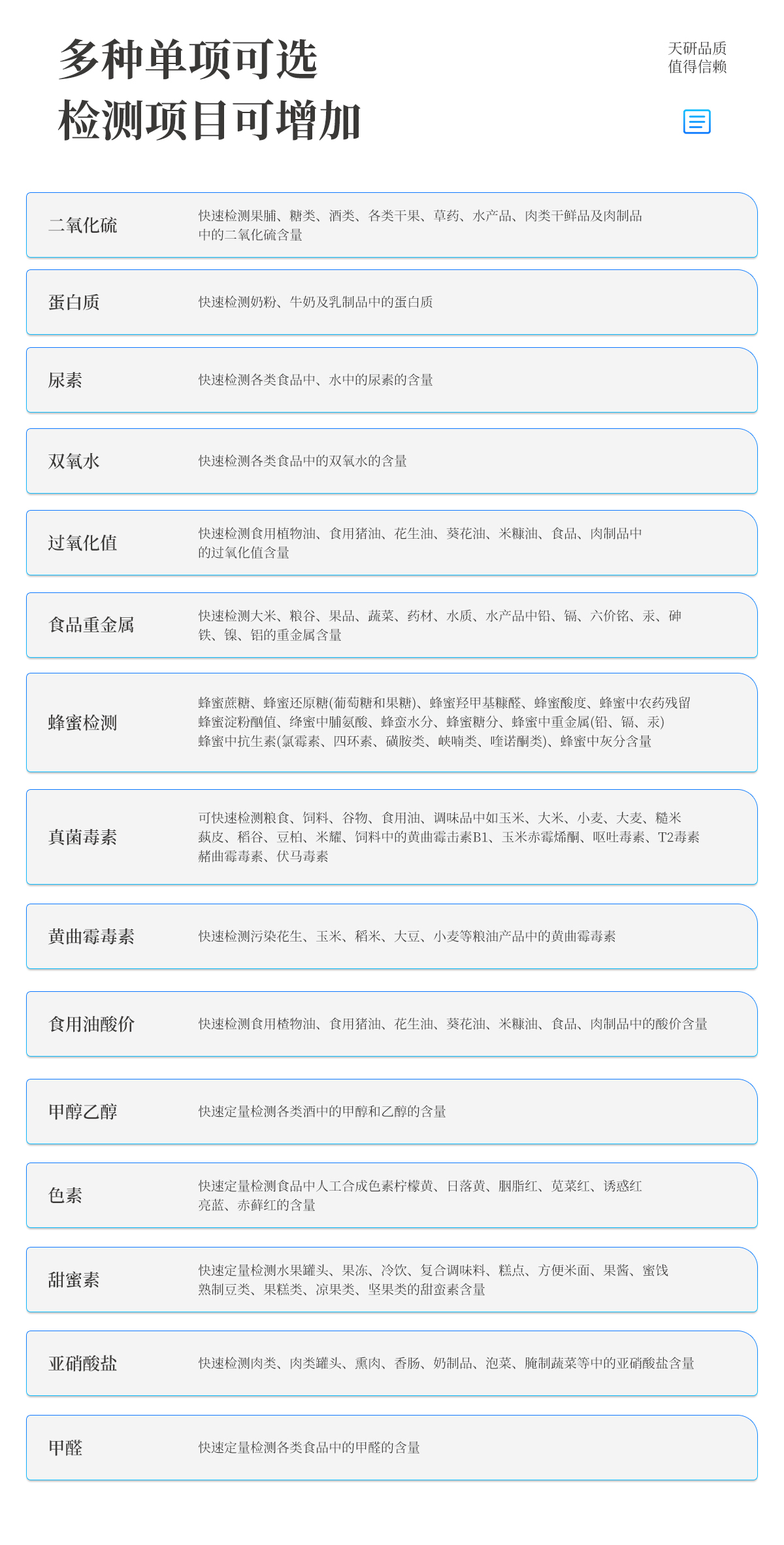 | 儀器采用臺式一體化系統檢測技術,將分光光度模塊、新型農殘檢測模塊、數字化管理模塊、無線通訊模塊高度集成于一體,支持檢測200種食品安全檢測項目,同時預留升級檢測方法。 | 儀器檢測模塊標準化、智能化,可隨意自由組合。檢測箱體內置多個標準檢測單元,檢測模塊可以調整配置。 | 儀器采用全新安卓智能系統,主控芯片采用 ARM Cortex-A7,RK3288/4核處理器,10.1寸高清液晶觸摸豎屏,更加**的UI交互界面,運轉快捷;儀器配備無線通信模塊: 4G(APN)通訊模塊、Wifi模塊,藍牙傳輸,同時具有雙USB接口以及RJ45接口能以多種方式實現數據保存和數據傳輸功能。 | 創新檢測模式: | ★檢測通道:≥12通道;采用精密旋轉比色池設計,使用同芯片同光源校準精度,解決不同光源之間的誤差值。1-12通道間誤差0.1%。(**號:ZL202022821055.2) | ★儀器具有自動識別比色皿檢測功能,即:將樣品比色皿放入儀器后,點擊樣品檢測,儀器自動識別比色皿進行通道檢測。 | 進口高精光源: | 高精度進口四波長冷光源,通道配置 410、520、590、630nm 波長光源,一個光源芯片驅動一個光源,誤差極小,每臺設備單獨**校準光源,**比對,同時參照四種不同波段光源全方位覆蓋市面上99%的農殘食品項目檢測。 | 智能化操作系統: | 便捷操作系統:設備檢測時可在同一檢測界面自動對應相關檢測通道一次性選擇1-12個樣品名稱,無須退出界面,節省操作時間。 | 數據集成系統:設備首頁自動統計檢測數據包含:周檢測數據、月檢測數據,全部檢測總數量,均包含檢測總數,合格數,不合格數,以及相關柱形分析圖,對各項檢測數據清晰掌握,無需電腦查詢,更加快捷直觀。 | 項目預設系統:支持添加單個及多個相同或不相同的任務預設,一鍵快速調取,每一個任務分別可以設置不同的樣品、批次、編號、來源、備注、抽樣信息、檢測信息、受檢信息、復核信息等更多信息。無縫鏈接平臺和APP實時查看下發任務。 | 數據監管系統:同步對接監管平臺,數據可局域網和互聯網數據上傳,檢測結果可選擇直接傳至食品安全監管平臺。集成OSS輸出存儲服務、區分設備定向管理應用,進行區域食品安全監管及大數據分析處理與數據統計,檢測區域食品安全長短期動態,達到食品安全問題預估、預警。 | 自定義打印系統:內置全新打印系統,新創自定義打印方式,可按需靈活設置開啟或關閉:產品合格證(國家農業部標準要求),二維碼,抽樣信息、檢測信息,受檢信息、復核信息、抽樣日期、檢測日期等信息的打印。 | 系統遠程更新功能:可定向分客戶分儀器更新系統,按照不同客戶后期實際需求添加項目,無需機器返廠,即可遠程實時升級全新系統,節省時間成本及避免運輸造成設備損壞。 | 儀器主機采用一體化防水、抗壓、防撞擊、防腐蝕箱體設計,同時配備交直流供電,可連接車載電源,可選配大容量充電鋰電池,滿足現場野外檢測需求。 | 安全證書,放心保障:儀器具有中國計量科學研究院校準證書,**認證。 |