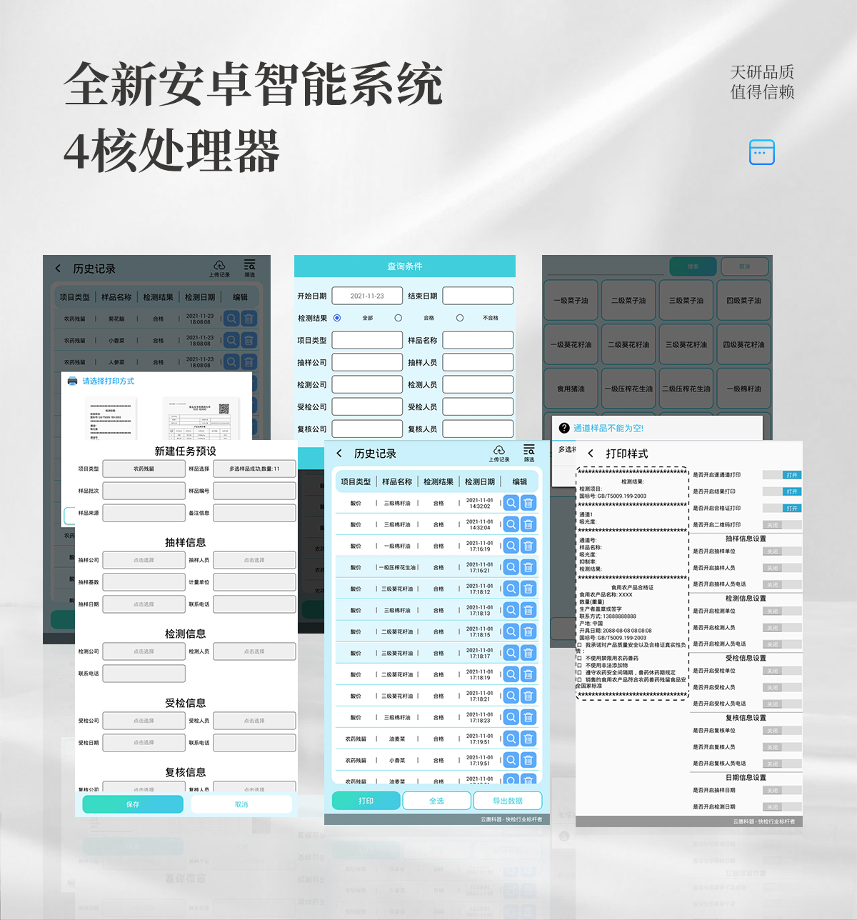 | 儀器采用手提一體化系統(tǒng)檢測(cè)技術(shù),將分光光度模塊、數(shù)字化管理模塊、無(wú)線通訊模塊高度集成于一體,可支持檢測(cè)60種食品安全檢測(cè)項(xiàng)目,同時(shí)預(yù)留升級(jí)檢測(cè)方法。 | 儀器檢測(cè)模塊標(biāo)準(zhǔn)化、智能化,檢測(cè)項(xiàng)目可隨意自由組合。檢測(cè)箱體內(nèi)置多個(gè)標(biāo)準(zhǔn)檢測(cè)單元,檢測(cè)模塊可以調(diào)整配置。 | 儀器采用全新安卓智能系統(tǒng),主控芯片采用 ARM Cortex-A7,RK3288/4核處理器,10.1寸高清液晶觸摸豎屏,更加**的UI交互界面,運(yùn)轉(zhuǎn)快捷;儀器配備無(wú)線通信模塊: 4G(APN)通訊模塊、Wifi模塊,藍(lán)牙傳輸,同時(shí)具有雙USB接口以及RJ45接口能以多種方式實(shí)現(xiàn)數(shù)據(jù)保存和數(shù)據(jù)傳輸功能。 | 顯示屏幕:儀器采用10.1英寸豎向液晶觸摸屏顯,搭配運(yùn)行安卓智能操作系統(tǒng),主控芯片采用ARM Cortex-A7,RK3288/4核處理器,主頻1.88Ghz,操作方便,性能更強(qiáng)。 | 檢測(cè)通道:≥12通道;采用精密旋轉(zhuǎn)比色池設(shè)計(jì),使用同芯片同光源校準(zhǔn)精度,解決不同光源之間的誤差值,更加準(zhǔn)確**。(1-12通道間誤差0.1%,**號(hào):ZL202022821055.2) | 儀器光源:高精度進(jìn)口四波長(zhǎng)冷光源,每個(gè)通道均配置 410、520、590、630nm 波長(zhǎng)光源,標(biāo)配**的光路切換裝置,**光路切換功能可實(shí)現(xiàn)64波長(zhǎng),并且所有檢測(cè)項(xiàng)目可實(shí)現(xiàn)所有通道同時(shí)檢測(cè)。 | 設(shè)備可一鍵校準(zhǔn),自動(dòng)保存校準(zhǔn)數(shù)據(jù),自動(dòng)對(duì)比校驗(yàn),得到精準(zhǔn)光源,采用Android SP存儲(chǔ)數(shù)據(jù),光源數(shù)據(jù)永不丟失,方便每一次使用。 | 通訊接口:配備無(wú)線通信模塊、4G(APN)通訊模塊、藍(lán)牙傳輸,同時(shí)具有雙USB接口以及RJ45網(wǎng)線接口,可以多方式實(shí)現(xiàn)數(shù)據(jù)保存及數(shù)據(jù)傳輸。 | 存儲(chǔ)方式:支持U盤存儲(chǔ),標(biāo)準(zhǔn)USB接口,免驅(qū)動(dòng)安裝。檢測(cè)結(jié)果存儲(chǔ)容量20萬(wàn)條以上,可生成Excel表格進(jìn)行拷貝,并具有登錄保護(hù)功能。 | 智能化操作系統(tǒng): | 1、操作系統(tǒng):儀器可在同一檢測(cè)界面自動(dòng)對(duì)應(yīng)相關(guān)檢測(cè)通道,一次性選擇1-12個(gè)樣品名稱,無(wú)需退出界面,節(jié)省操作時(shí)間。并可以對(duì)每個(gè)通道屬性和樣品信息單獨(dú)進(jìn)行編輯,例如送檢單位、人員,檢測(cè)人員等,打印時(shí)勾選打印顯示。 | 2、數(shù)據(jù)集成系統(tǒng):設(shè)備首頁(yè)自動(dòng)匯總分析檢測(cè)數(shù)據(jù),包含:周檢測(cè)數(shù)據(jù)、月檢測(cè)數(shù)據(jù),全部檢測(cè)總數(shù)量,均包含檢測(cè)總數(shù),合格數(shù),不合格數(shù),以及相關(guān)柱形分析圖,各項(xiàng)檢測(cè)數(shù)據(jù)一目了然,無(wú)需電腦查詢,更加快捷直觀。 | 3、數(shù)據(jù)庫(kù)系統(tǒng):十幾項(xiàng)數(shù)據(jù)庫(kù)分類管理儀器:包含項(xiàng)目類型、項(xiàng)目數(shù)據(jù)、檢測(cè)數(shù)據(jù)、歷史記錄、國(guó)標(biāo)信息、曲線信息、采樣信息、檢測(cè)信息、受檢信息、復(fù)核信息、圖表信息、光源校準(zhǔn)信息、打印樣式信息、樣品庫(kù)信息等等,數(shù)據(jù)庫(kù)之間互相協(xié)調(diào)聯(lián)動(dòng)保證數(shù)據(jù)的真實(shí)完整性。同時(shí)產(chǎn)品數(shù)據(jù)庫(kù)以及歷史檢測(cè)記錄支持一鍵檢索功能。 | 4、限量規(guī)判系統(tǒng):具有限量查詢、添加物質(zhì)合規(guī)判定系統(tǒng)。檢測(cè)出結(jié)果后,系統(tǒng)自動(dòng)調(diào)用系統(tǒng)數(shù)據(jù)庫(kù)中相關(guān)國(guó)標(biāo)進(jìn)行比對(duì)判定,客觀顯示判定結(jié)果是否合格。 | 5、項(xiàng)目預(yù)設(shè)系統(tǒng):儀器具有任務(wù)預(yù)設(shè)模塊,一鍵提前預(yù)設(shè),給出方便快捷的新檢測(cè)方案,每一個(gè)任務(wù)分別可以設(shè)置不同的樣品、批次、編號(hào)、來(lái)源、備注、抽樣信息、檢測(cè)信息、受檢信息、復(fù)核信息等更多信息。樣品送檢時(shí)一鍵調(diào)取保存信息,并可多次調(diào)取,大大提高檢測(cè)效率。 | 6、數(shù)據(jù)監(jiān)管系統(tǒng):同步對(duì)接監(jiān)管平臺(tái),數(shù)據(jù)可局域網(wǎng)和互聯(lián)網(wǎng)數(shù)據(jù)上傳,檢測(cè)結(jié)果可選擇直接傳至食品安全監(jiān)管平臺(tái)。進(jìn)行區(qū)域食品安全監(jiān)管及大數(shù)據(jù)分析處理與數(shù)據(jù)統(tǒng)計(jì),檢測(cè)區(qū)域食品安全長(zhǎng)短期動(dòng)態(tài),達(dá)到食品安全問(wèn)題預(yù)估、預(yù)警。 | 7、全新打印系統(tǒng):內(nèi)置全新打印機(jī),新創(chuàng)自定義打印方式,可按需靈活勾選控制:二維碼,抽樣信息、檢測(cè)信息,受檢信息、復(fù)核信息、抽樣日期、檢測(cè)日期等信息的打印。 | 8、A4紙版本報(bào)告打印功能(可選配):設(shè)備擁有兩種結(jié)果展示方式,可以自動(dòng)生成A4打印模板和小票打印模板兩種樣式,可通過(guò)WiFi及網(wǎng)線等方式鏈接外置打印機(jī)可進(jìn)行打印。 | 供電模式:儀器交直流兩用,直流12V供電,可連接車載電源,可配6ah大容量充電鋰電池,電量可實(shí)時(shí)顯示,方便戶外流動(dòng)測