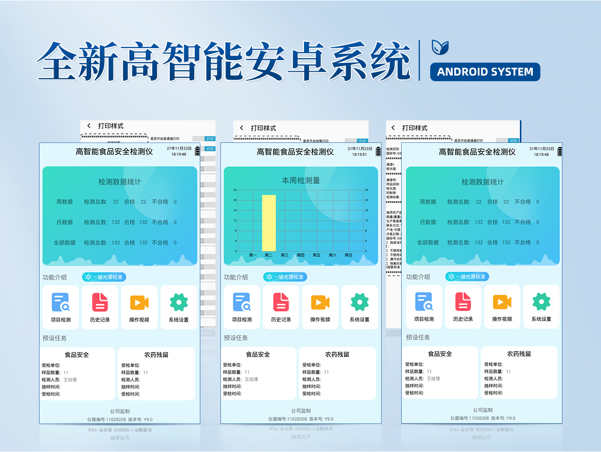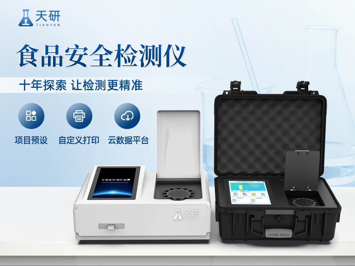 山東天研儀器有限公司生產的高智能食品安全檢測儀為集成化食品安全快速檢測分析設備,采用臺式一體化設計,可快速檢測200多種食品安全項目,包含非食用化學物質、濫用食品添加劑、農藥殘留、獸藥殘留、重金屬、病害肉、營養強化劑、抗生素類殘留、激素類殘留、真菌毒素類殘留、化學類殘留等項目的定性定量檢測。 目前廣泛應用于市場監管局、檢測中心、衛生監督部門、農業部門、院校及各單位食堂、食品肉產品深加工企業、商超市場、司法部門、餐飲機構、養殖場、屠宰場、檢驗檢疫部門等單位。