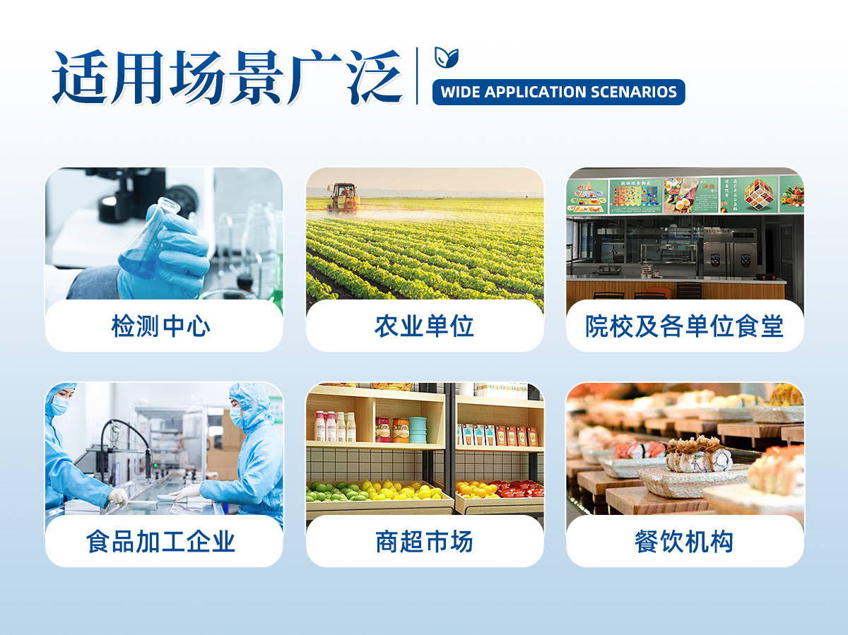 食品添加劑:二氧化硫、雙氧水、亞硝酸鹽、硝酸鹽、苯甲酸鈉、山梨酸鉀、糖精鈉、甜蜜素、木耳硫酸鎂等 有毒有害物質:甲醛、吊白塊、硼砂、過氧化苯甲酰、溴酸鉀、羅丹明B、三聚氰胺、蘇丹紅、工業堿、尿素、明礬等 食用油脂:過氧化值、酸價等 果蔬:農藥殘留(酶抑制率法) 病害肉:組胺、揮發性鹽基氮 重金屬含量: 鉛、鎘、鉻、汞、砷、錫、鎳、鋁等 瘦肉精激素:鹽酸克倫特羅、沙丁胺醇、萊克多巴胺、己烯雌酚等 抗生素殘留:四環素類、硝基呋喃類、磺胺類、β-興奮劑類、沙星類、磺胺類、喹諾酮類,甲砜霉素,氟苯尼考,金剛烷胺、替米考星、慶大霉素、林可霉素、鏈霉素、恩諾沙星、環丙沙星、頭孢啦啶、青霉素、阿莫西林等 水產品安全類:孔雀石綠、氯霉素、呋喃妥因、呋喃西林、呋喃它酮、呋喃唑酮等 蛋類藥物殘留:氯霉素,四環素,磺胺類,喹諾酮類,呋喃西林,呋喃它酮,呋喃妥因,呋喃唑酮,氟苯尼考,阿莫西林、頭孢氨芐、紅霉素、鏈霉素等 真菌毒素殘留:食用油、糧食及飼料中黃曲霉毒素B1、黃曲霉毒素總量,奶中黃曲霉毒素M1、嘔吐毒素、玉米赤霉烯酮、赭曲霉毒素A、T2毒素、伏馬毒素等 水酒飲品分析:酒中甲醇、乙醇、乳品及牛奶中蛋白質, 蜂蜜成分:果糖和葡萄糖、蔗糖、淀粉酶、酸度等 調味品成分:食醋的總酸、醬油的總酸、芝麻油純度、谷氨酸鈉、醬油氨基酸態氮、食鹽中亞鐵氰化鉀、食鹽中碘等 食用色素類:紅色色素(胭脂紅、莧菜紅、莧菜紅)、黃色色素(檸檬黃、日落黃)、藍色色素(亮藍)等 動物疫病類:禽流感、新城疫、牛羊口蹄疫、牛羊結核病、牛羊包蟲、牛羊布病、小反芻獸、豬藍耳病毒、豬瘟病毒、豬偽狂犬病毒、豬細小、豬圓環、犬細小病毒、犬瘟熱病毒、犬狂犬病毒等