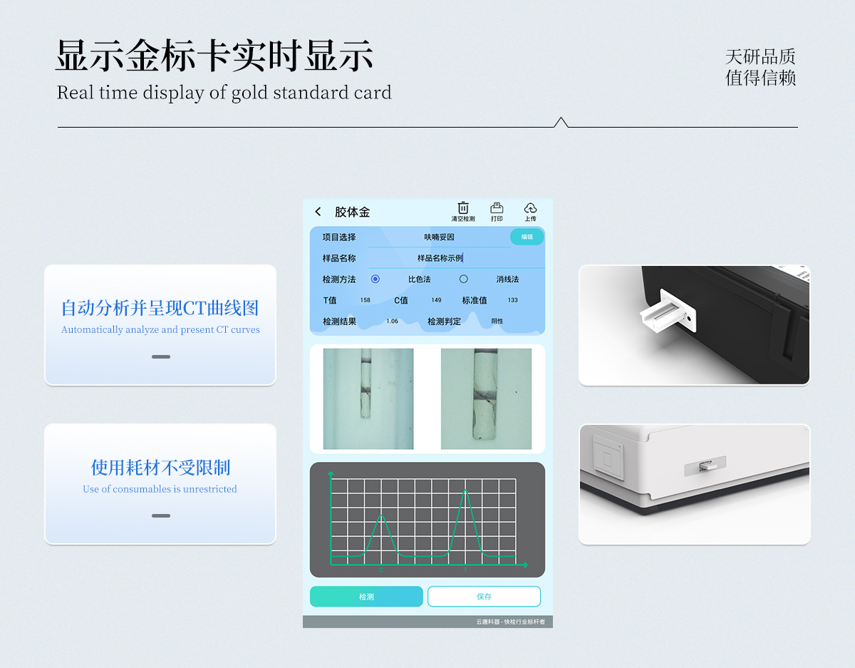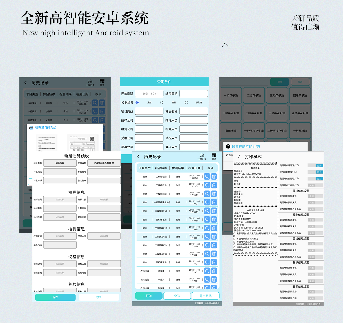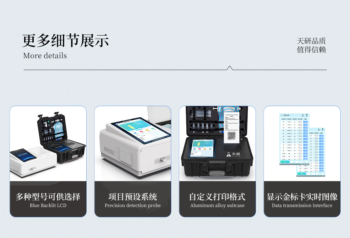 | 儀器采用手提一體化系統(tǒng)檢測技術(shù),將分光光度模塊、膠體金檢測模塊、新型農(nóng)殘檢測模塊、數(shù)字化管理模塊、無線通訊模塊高度集成于一體,支持檢測200種食品安全檢測項目,同時預(yù)留升級檢測方法。 | 儀器檢測模塊標(biāo)準(zhǔn)化、智能化,檢測項目可隨意自由組合。檢測箱體內(nèi)置多個標(biāo)準(zhǔn)檢測單元,檢測模塊可以調(diào)整配置。 | 顯示屏幕:儀器采用10.1英寸豎向液晶觸摸屏顯,搭配運行安卓智能操作系統(tǒng),主控芯片采用ARM Cortex-A7,RK3288/4核處理器,主頻1.88Ghz,操作方便,性能更強。 | 檢測通道:≥12通道;采用精密旋轉(zhuǎn)比色池設(shè)計,使用同芯片同光源校準(zhǔn)精度,解決不同光源之間的誤差值,更加準(zhǔn)確**。(1-12通道間誤差0.1%,**號:ZL202022821055.2) | 儀器光源:高精度進(jìn)口四波長冷光源,每個通道均配置 410、520、590、630nm 波長光源,標(biāo)配**的光路切換裝置,**光路切換功能可實現(xiàn)64波長,并且所有檢測項目可實現(xiàn)所有通道同時檢測。 | 設(shè)備可一鍵校準(zhǔn),自動保存校準(zhǔn)數(shù)據(jù),自動對比校驗,得到精準(zhǔn)光源,采用Android SP存儲數(shù)據(jù),光源數(shù)據(jù)永不丟失,方便每一次使用。 | 通訊接口:配備無線通信模塊、4G(APN)通訊模塊、藍(lán)牙傳輸,同時具有雙USB接口以及RJ45網(wǎng)線接口,可以多方式實現(xiàn)數(shù)據(jù)保存及數(shù)據(jù)傳輸。 | 存儲方式:支持U盤存儲,標(biāo)準(zhǔn)USB接口,免驅(qū)動安裝。檢測結(jié)果存儲容量20萬條以上,可生成Excel表格進(jìn)行拷貝,并具有登錄保護(hù)功能。 | 智能化操作系統(tǒng):: ★操作系統(tǒng):儀器可在同一檢測界面自動對應(yīng)相關(guān)檢測通道,一次性選擇1-12個樣品名稱,無需退出界面,節(jié)省操作時間。并可以對每個通道屬性和樣品信息單獨進(jìn)行編輯,例如送檢單位、人員,檢測人員等,打印時勾選打印顯示。 | ★數(shù)據(jù)集成系統(tǒng):設(shè)備首頁自動匯總分析檢測數(shù)據(jù),包含:周檢測數(shù)據(jù)、月檢測數(shù)據(jù),全部檢測總數(shù)量,均包含檢測總數(shù),合格數(shù),不合格數(shù),以及相關(guān)柱形分析圖,各項檢測數(shù)據(jù)一目了然,無需電腦查詢,更加快捷直觀。 | ★數(shù)據(jù)庫系統(tǒng):十幾項數(shù)據(jù)庫分類管理儀器:包含項目類型、項目數(shù)據(jù)、檢測數(shù)據(jù)、歷史記錄、國標(biāo)信息、曲線信息、采樣信息、檢測信息、受檢信息、復(fù)核信息、圖表信息、光源校準(zhǔn)信息、打印樣式信息、樣品庫信息等等,數(shù)據(jù)庫之間互相協(xié)調(diào)聯(lián)動保證數(shù)據(jù)的真實完整性。同時產(chǎn)品數(shù)據(jù)庫以及歷史檢測記錄支持一鍵檢索功能。 | ★限量規(guī)判系統(tǒng):具有限量查詢、添加物質(zhì)合規(guī)判定系統(tǒng)。檢測出結(jié)果后,系統(tǒng)自動調(diào)用系統(tǒng)數(shù)據(jù)庫中相關(guān)國標(biāo)進(jìn)行比對判定,客觀顯示判定結(jié)果是否合格 | ★項目預(yù)設(shè)系統(tǒng):儀器具有任務(wù)預(yù)設(shè)模塊,一鍵提前預(yù)設(shè),給出方便快捷的新檢測方案,每一個任務(wù)分別可以設(shè)置不同的樣品、批次、編號、來源、備注、抽樣信息、檢測信息、受檢信息、復(fù)核信息等更多信息。樣品送檢時一鍵調(diào)取保存信息,并可多次調(diào)取,大大提高檢測效率。 | ★數(shù)據(jù)監(jiān)管系統(tǒng):同步對接監(jiān)管平臺,數(shù)據(jù)可局域網(wǎng)和互聯(lián)網(wǎng)數(shù)據(jù)上傳,檢測結(jié)果可選擇直接傳至食品安全監(jiān)管平臺。進(jìn)行區(qū)域食品安全監(jiān)管及大數(shù)據(jù)分析處理與數(shù)據(jù)統(tǒng)計,檢測區(qū)域食品安全長短期動態(tài),達(dá)到食品安全問題預(yù)估、預(yù)警。 | ★打印系統(tǒng):內(nèi)置全新打印機,新創(chuàng)自定義打印方式,可按需靈活勾選控制:產(chǎn)品合格證(國家農(nóng)業(yè)部標(biāo)準(zhǔn)要求),二維碼,抽樣信息、檢測信息,受檢信息、復(fù)核信息、抽樣日期、檢測日期等信息的打印。 | 供電模式:儀器交直流兩用,直流12V供電,可連接車載電源,可配6ah大容量充電鋰電池,電量可實時顯示,方便戶外流動測試。 | 膠體金檢測模塊:采用雙通道CMOS成像處理技術(shù)及膠體金免疫層析技術(shù),可同時讀取雙膠體金卡數(shù)據(jù),自動采集、處理分析,將檢測結(jié)果顯示,并可根據(jù)參考限值自動判斷檢測結(jié)果,可檢測常見的獸藥殘留、生物毒素、抗生素、違禁添加物等。 | ★探測技術(shù):CMOS成像探測; | ★檢測通道:1個通道; | ★檢測方式:消線法和比色法; | ★顯示模式:陰性或陽性; | 曲線形式:軌道式掃描方式,顯示金標(biāo)卡圖像,實時生成、識別CT曲線圖,無需手動調(diào)整,完成檢測后自動退出檢測卡。兼容市場上其他金標(biāo)卡,使用耗材不受限制。 | 儀器具備遠(yuǎn)程升級功能,可定向分客戶分儀器更新,開機后自動更新,并可持續(xù)性免費更新系統(tǒng)版本,無需像傳統(tǒng)產(chǎn)品返廠更新,節(jié)省時間及人力成本并避免了物流運輸返廠升級導(dǎo)致設(shè)備損壞的潛在風(fēng)險。 |
