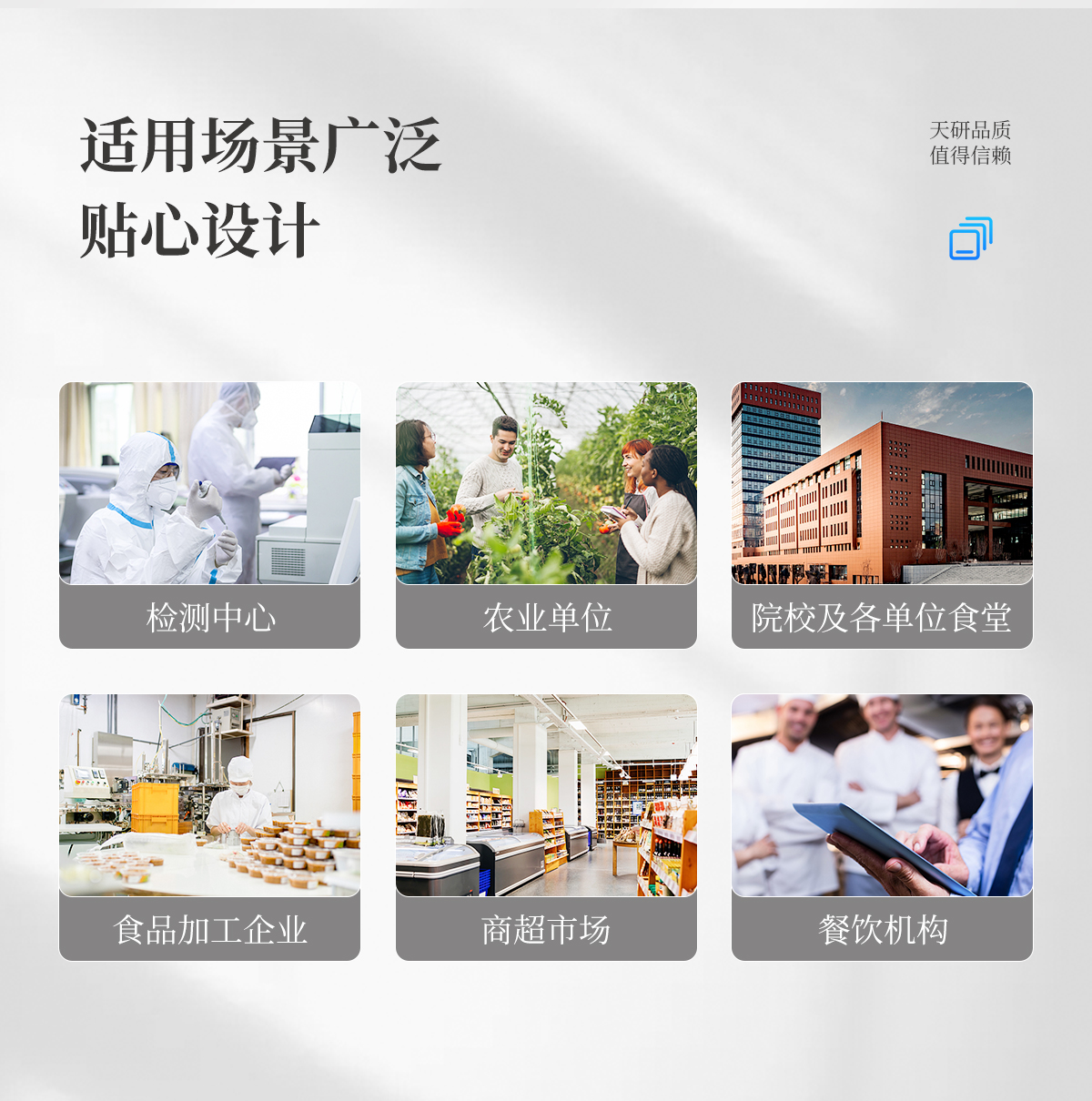 多功能食品安全檢測儀可快速檢測200多項目,包含非食用化學物質、濫用食品添加劑、農藥殘留、獸藥殘留、重金屬、病害肉、營養強化劑、抗生素類殘留、激素類殘留、真菌毒素類殘留、化學類殘留等現場的定性定量檢測。該多功能食品安全檢測儀為集成化食品安全快速檢測分析設備,廣泛應用于市場監管局、檢測中心、衛生監督部門、農業部門、院校及各單位食堂、食品肉產品深加工企業、商超市場、司法部門、餐飲機構、養殖場、屠宰場、檢驗檢疫部門等單位使用。