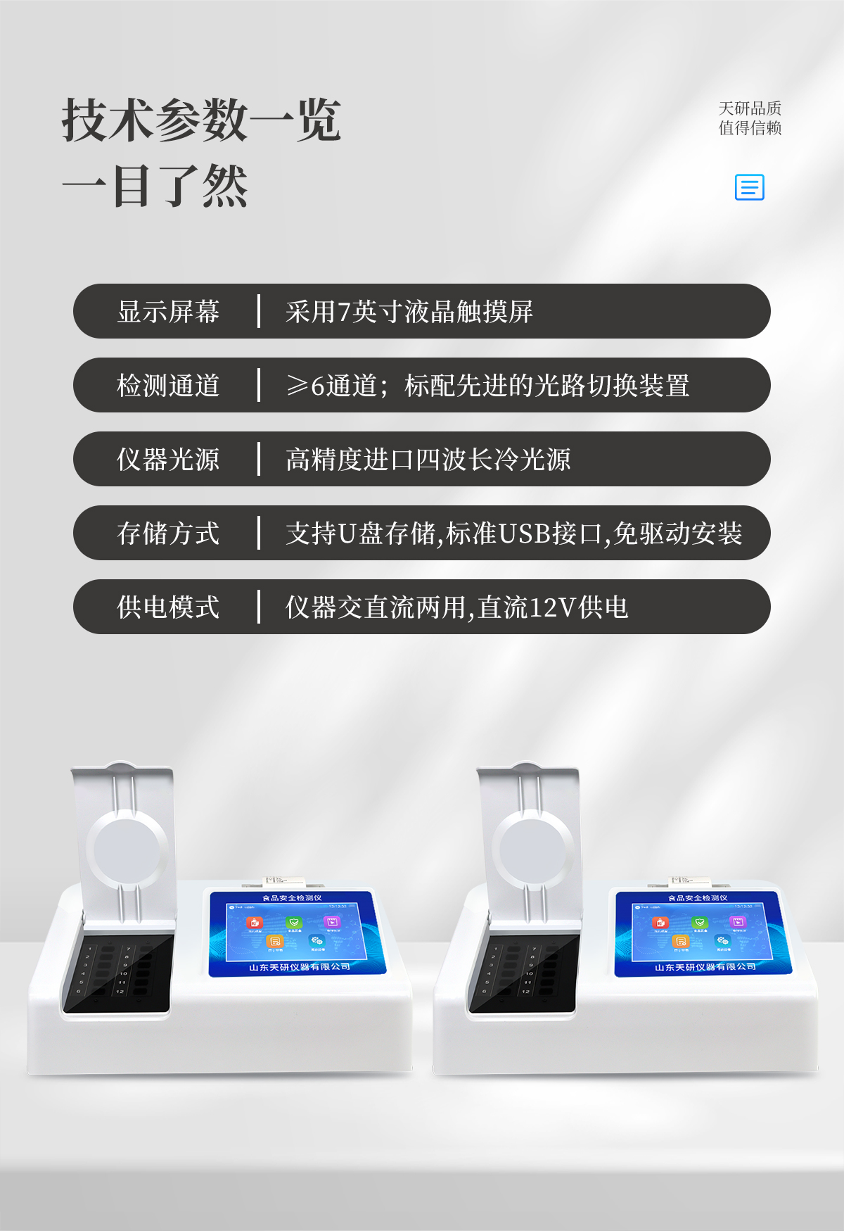 產品詳情:產品介紹:多功能食品安全檢測儀可快速檢測200多項目,包含非食用化學物質、濫用食品添加劑、農藥殘留、獸藥殘留、重金屬、病害肉、營養強化劑、抗生素類殘留、激素類殘留、真菌毒素類殘留、化學類殘留等現場的定性定量檢測。該多功能食品安全檢測儀為集成化食品安全快速檢測分析設備,廣泛應用于市場監管局、檢測中心、衛生