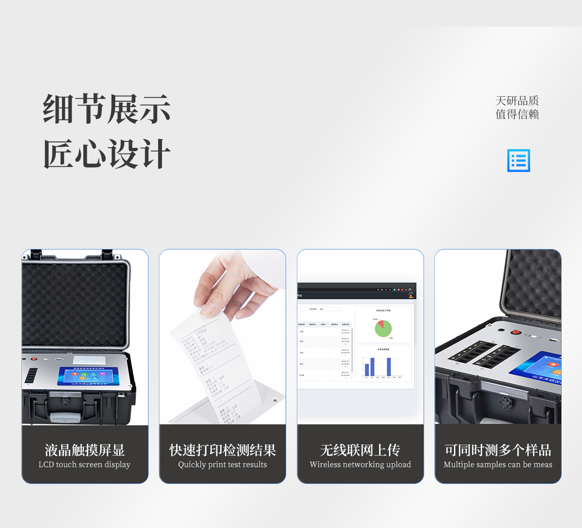 | 安卓智能操作系統,采用更加**的UI交互界面,儀器具有wifi聯網上傳、4G聯網傳輸、GPRS無線遠傳、網線連接功能,快速批量上傳數據。 | 智能化程度高,儀器具有自檢功能:具有開機自檢和調零功能,具有自動檢測重復性功能。 | 新一代高速熱敏打印機,檢測完成可自動打印或批量打印檢測報告和二維碼。 | 儀器帶有監管平臺,數據可局域網和互聯網數據上傳,檢測結果直接傳至食品安全監管平臺。進行區域食品安全監管及大數據分析處理與數據統計,檢測區域食品安全長短期動態,達到食品安全問題預估、預警 | 一體化主機,包含食品安全檢測模塊、多通道農藥殘留檢測模塊、膠體金免疫層析檢測模塊。 | 一體化便攜式快檢設備,滿足現場及流動檢測使用需求,能夠在同一軟件下實現所有檢測項目的檢測,并可通過同一窗口直觀顯示檢測結果。 | 膠體金模塊檢測方式:軌道式自動傳輸掃描,檢測完成后自動退出檢測卡。 | CT線自動識別,無需手動調整。 | 內置強大的數據庫,具有多品類多種類樣品菜單功能,可靈活選擇檢測樣品,不同的檢測通道可同時檢測不同的樣品項目。也可在儀器上直接編輯錄入樣品名稱、檢測指標、送檢單位等信息并保存進樣品數據庫。 | 產品內置操作演示視頻,是您身邊的化驗指導專家。 | 樣品處理簡單省力,整體操作快速、安全、便捷。 | 儀器具有自身保護功能,可設置用戶名及密碼,防止非工作人員操作等。 | 高靈敏度,高檢測精度,高重復性精度,掃描式高精度光學傳感器。 | 結果判定線可修改,對照值標定值可保存,斷電不丟失數據。 | 兼容市場上所有的膠體金卡,使用耗材不受限制,極大增強用戶使用體驗。 | 儀器具有重新校準、鎖定、恢復出廠設置功能。 |