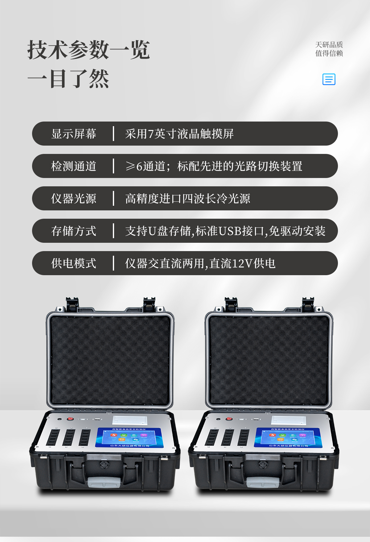 主控芯片采用ARM Cortex-A7,RK3288/4核處理器,主頻1.88Ghz,運轉速度更快速,穩定性更強。顯示方式:7英寸液晶觸摸屏顯示,人性化中文操作界面,讀數直觀、簡單。 交直流兩用,直流12V供電,可連接車載電源,可配6ah大容量充電鋰電池,方便戶外流動測試。四波長冷光源,6個檢測通道,每個通道均配置410、520、590、630nm波長光源,標配**的光路切換裝置,專業光路切換功能可實現*多64波長,并且所有檢測項目可實現所有通道同時檢測。智能恒流穩壓,光強自動調節與校準,長時間連續工作光源無溫漂現象。內置新國家限量標準,與所測結果進行現場比對,并持續更新標準。不間斷進樣,連續檢測 樣本編號自動累加。 數據無線上傳平臺,并可從平臺導出為Excel表格。檢測結果存儲容量20萬條同時支持U盤拷貝,標準USB接口,免驅動插拔。檢測項目可擴充,固件可升級儀器尺寸:43×35×19cm, 主機凈重:5.1kg