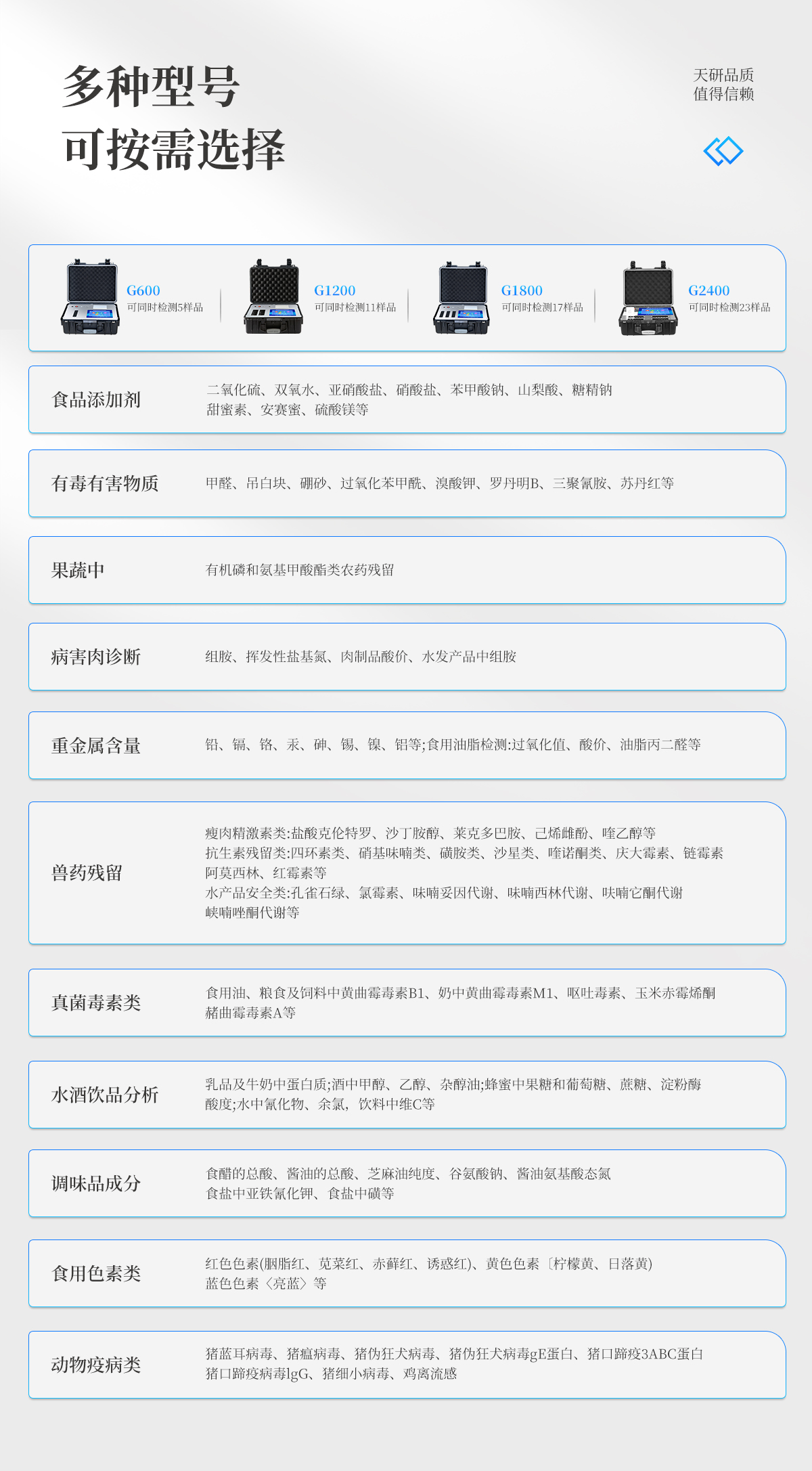 食品添加劑:二氧化硫、雙氧水、亞硝酸鹽、硝酸鹽、苯甲酸鈉、山梨酸、糖精鈉、甜蜜素、安賽蜜、硫酸鎂等有毒有害物質:甲醛、吊白塊、硼砂、過氧化苯甲酰、溴酸鉀、羅丹明B、三聚氰胺、蘇丹紅等果蔬中:有機磷和氨基甲酸酯類農藥殘留;病害肉診斷:組胺、揮發性鹽基氮、肉制品酸價、水發產品中組胺重金屬含量:鉛、鎘、鉻、汞、砷、錫、鎳、鋁等;食用油脂檢測:過氧化值、酸價、油脂丙二醛等。瘦肉精激素類(獸藥):鹽酸克倫特羅、沙丁胺醇、萊克多巴胺、己烯雌酚、喹乙醇等抗生素殘留類(獸藥):四環素類、硝基呋喃類、磺胺類、沙星類、喹諾酮類、慶大霉素、鏈霉素、阿莫西林、紅霉素等水產品安全類:孔雀石綠、氯霉素、呋喃妥因代謝、呋喃西林代謝、呋喃它酮代謝、呋喃唑酮代謝等真菌毒素類:食用油、糧食及飼料中黃曲霉毒素B1、奶中黃曲霉毒素M1、嘔吐毒素、玉米赤霉烯酮、赭曲霉毒素A等水酒飲品分析:乳品及牛奶中蛋白質;酒中甲醇、乙醇、雜醇油;蜂蜜中果糖和葡萄糖、蔗糖、淀粉酶、酸度;水中氰化物、余氯,飲料中維C等調味品成分:食醋的總酸、醬油的總酸、芝麻油純度、谷氨酸鈉、醬油氨基酸態氮、食鹽中亞鐵氰化鉀、食鹽中碘等食用色素類:紅色色素(胭脂紅、莧菜紅、赤蘚紅、誘惑紅)、黃色色素(檸檬黃、日落黃)、藍色色素(亮藍)等動物疫病類:豬藍耳病毒、豬瘟病毒、豬偽狂犬病毒、豬偽狂犬病毒gE蛋白、豬口蹄疫3ABC蛋白、豬口蹄疫病毒IgG、豬細小病毒、雞禽流感等