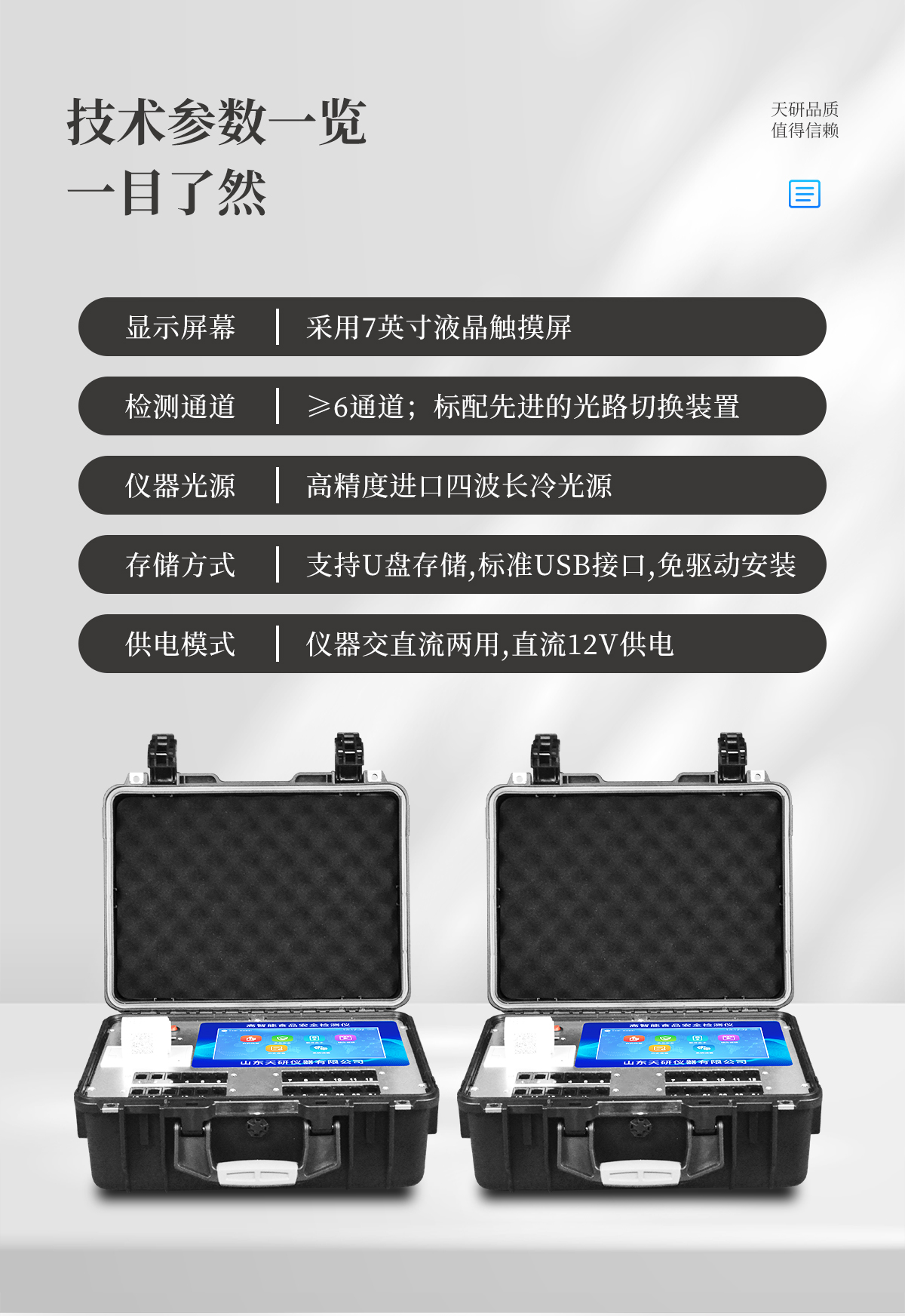 | 安卓智能操作系統,采用更加**的UI交互界面,儀器具有wifi聯網上傳、4G聯網傳輸、GPRS無線遠傳、網線連接功能,快速批量上傳數據。 | 智能化程度高,儀器具有自檢功能:具有開機自檢和調零功能,具有自動檢測重復性功能。 | 新一代高速熱敏打印機,檢測完成可自動打印或批量打印檢測報告和二維碼。 | 儀器帶有監管平臺,數據可局域網和互聯網數據上傳,檢測結果直接傳至食品安全監管平臺。進行區域食品安全監管及大數據分析處理與數據統計,檢測區域食品安全長短期動態,達到食品安全問題預估、預警 | 一體化主機,包含食品安全檢測模塊、多通道農藥殘留檢測模塊、膠體金免疫層析檢測模塊。 | 一體化便攜式快檢設備,滿足現場及流動檢測使用需求,能夠在同一軟件下實現所有檢測項目的檢測,并可通過同一窗口直觀顯示檢測結果。 | 膠體金模塊檢測方式:軌道式自動傳輸掃描,檢測完成后自動退出檢測卡。 | CT線自動識別,無需手動調整。 | 內置強大的數據庫,具有多品類多種類樣品菜單功能,可靈活選擇檢測樣品,不同的檢測通道可同時檢測不同的樣品項目。也可在儀器上直接編輯錄入樣品名稱、檢測指標、送檢單位等信息并保存進樣品數據庫。 | 產品內置操作演示視頻,是您身邊的化驗指導專家。 | 樣品處理簡單省力,整體操作快速、安全、便捷。 | 儀器具有自身保護功能,可設置用戶名及密碼,防止非工作人員操作等。 | 高靈敏度,高檢測精度,高重復性精度,掃描式高精度光學傳感器。 | 結果判定線可修改,對照值標定值可保存,斷電不丟失數據。 | 兼容市場上所有的膠體金卡,使用耗材不受限制,極大增強用戶使用體驗。 | 儀器具有重新校準、鎖定、恢復出廠設置功能。 |