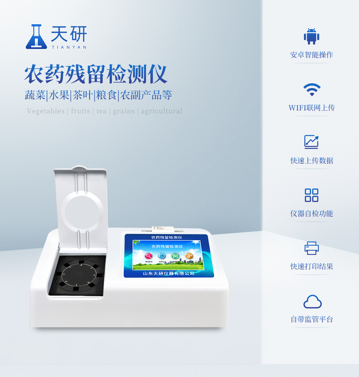 山東天研儀器有限公司生產的農藥殘留檢測儀廣泛應用于主要用于蔬菜、水果、茶葉、糧食、農副產品等食品中農藥殘留的快速檢測,依據國標GB/T5009.199-2003進行檢測,適用于果蔬茶生產基地以及農貿批發銷售市場現場檢測,餐館、學校、食堂、家庭果蔬加工前的安全速測等。