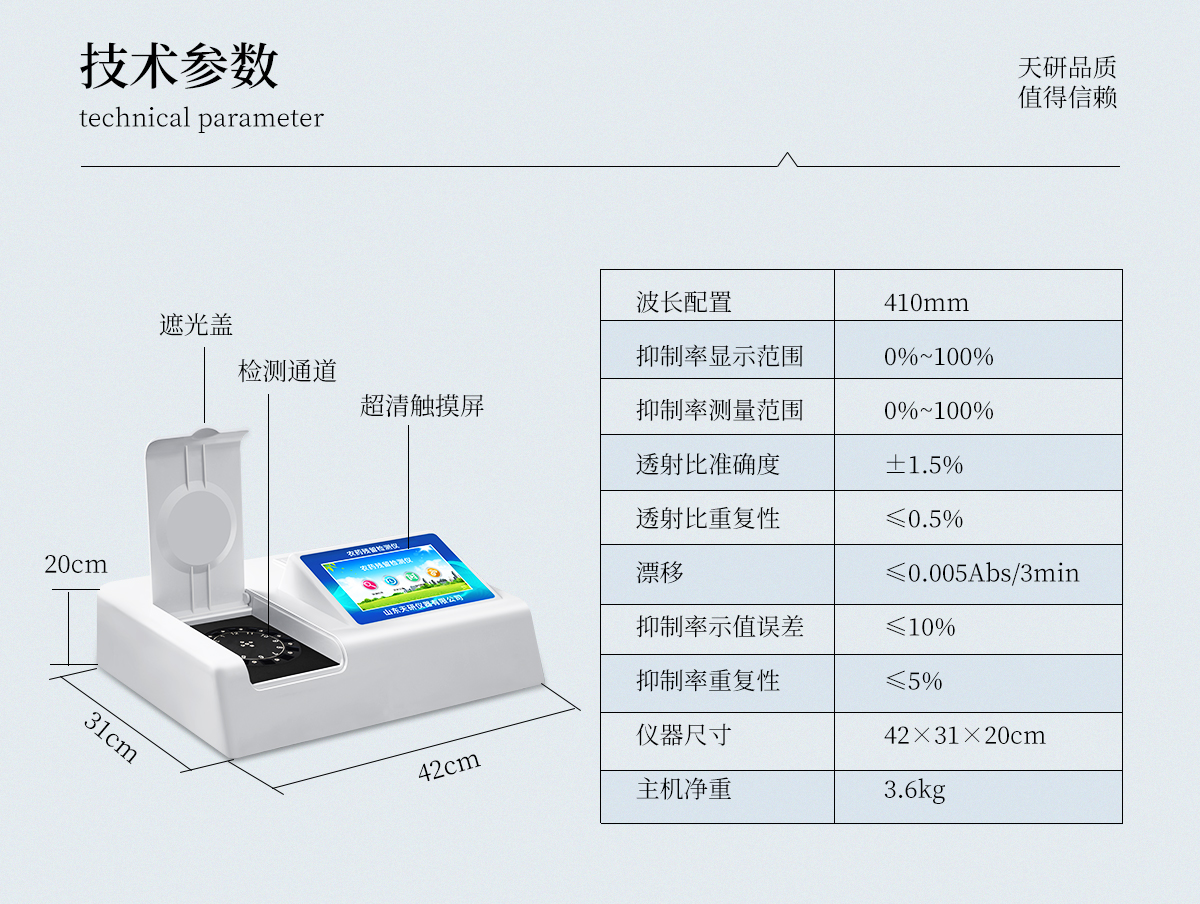 產品詳情:產品簡介:山東天研儀器有限公司生產的農藥殘留檢測儀廣泛應用于主要用于蔬菜、水果、茶葉、糧食、農副產品等食品中農藥殘留的快速檢測,依據國標GB/T5009.199-2003進行檢測,適用于果蔬茶生產基地以及農貿批發銷售市場現場檢測,餐館、學校、食堂、家庭果蔬加工前的安全速測等。技術參數:機器采用全新安卓智能系統,主控芯