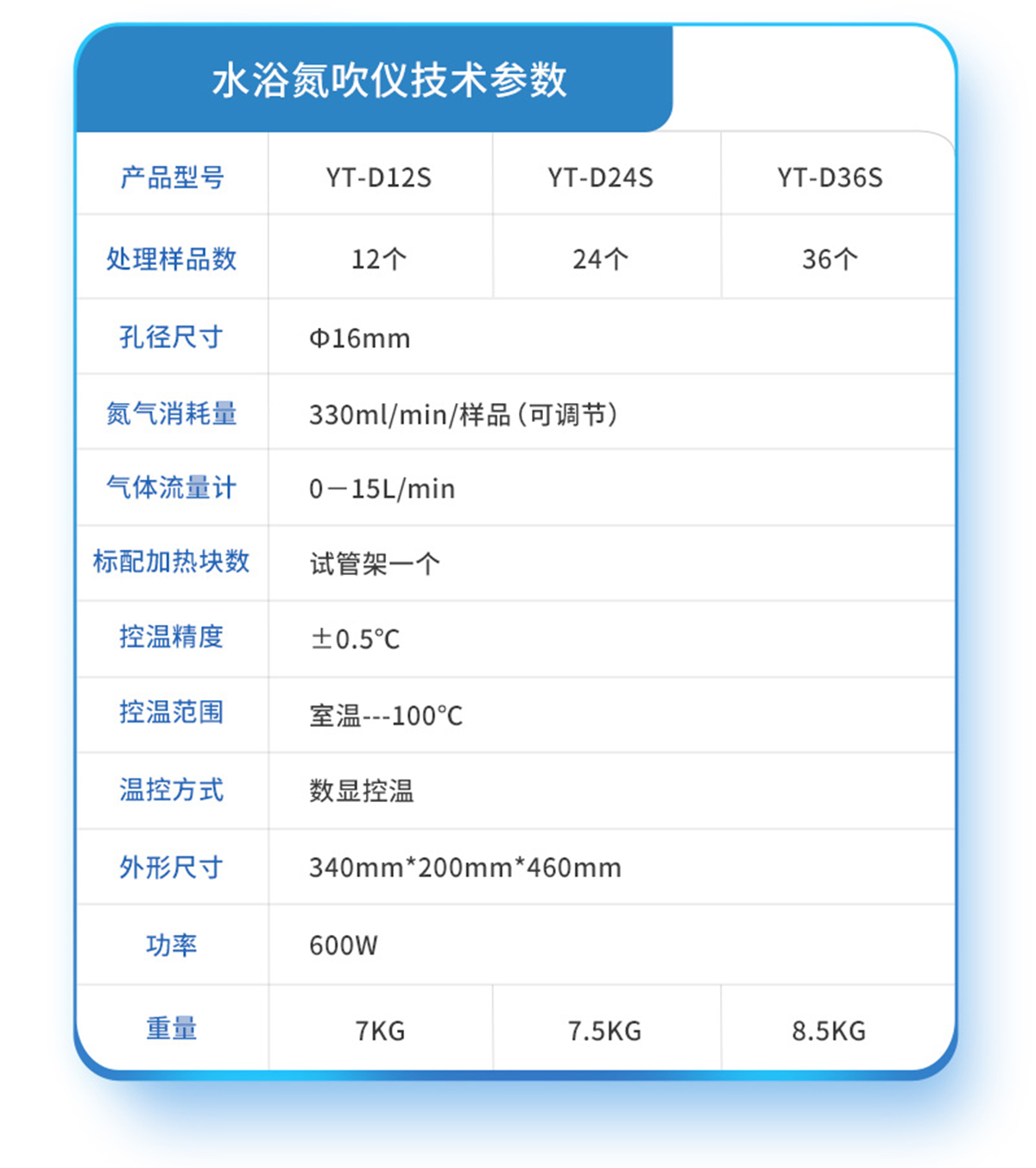 | YT-D12S | 12個(gè) | Ф16mm | 330ml/min/樣品(可調(diào)節(jié)) | 0-15L/min | 試管架一個(gè) | ±0.5℃ | 室溫---100℃ | 數(shù)顯控溫 | 340*200*460 | 600W | 7KG |