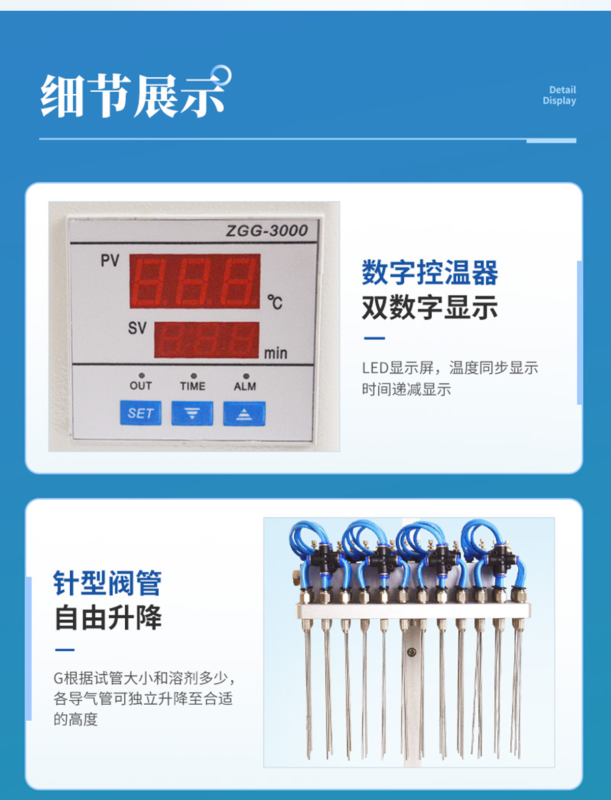 | 分配室上各氣針通道可組合使用或單獨(dú)使用,每一路氣針均可單獨(dú)開關(guān)。分配室的高度可視需要調(diào)節(jié)。 | 每一路氣體流量可單獨(dú)進(jìn)行調(diào)節(jié),克服了不可調(diào)氮吹儀各氣路氣流量大小不一的弱點(diǎn)。 | 數(shù)字溫控器,雙數(shù)字顯示. | 可能與溶劑接觸的部件均采用不銹鋼材料、合金鋁并表面進(jìn)行塑料噴涂,使用壽命長(zhǎng)且清潔方便。 | 整機(jī)可放入通風(fēng)櫥中使用。 | 一般標(biāo)配的加熱塊規(guī)格為孔徑∮16mm。 |