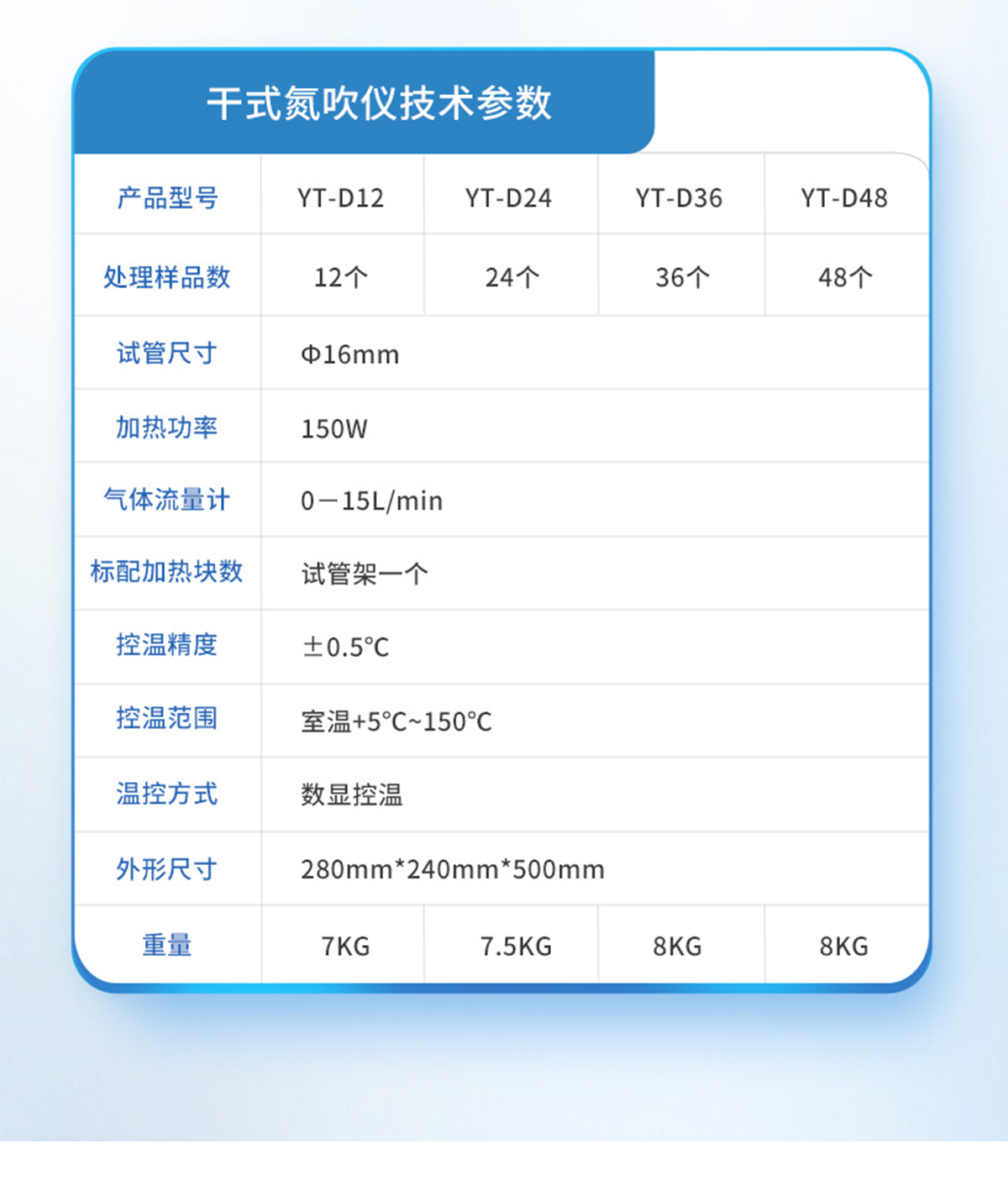 | YT-D12SY | 12個獨立控制 | 圓形水浴 | 10~29mm | 0--150mm | 360°C | ±0.5℃ | 室溫---100℃ | 4位數顯/PID調節/超溫報警 | 0~99h59min | 可控 0-15L/min | 330ml/min/樣品 | 1000W | 10KG |