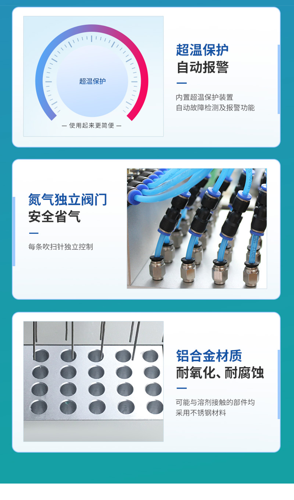 | 每個吹針都可以獨立控制,避免引起交叉污染。 | 儀器氣腔高度可以自行調節,配備標準氣針長度為15厘米。 | 氮吹儀有36個氣道控制開關,節約氣體,每根吹氣針的位置可獨立改變吹掃位置,使之適用不同的樣品容器及不同的樣品位置 | 在濃縮有毒溶劑時,整個系統可置于通風柜中,降低危險。 | 內置超溫保護裝置,自動故障檢測及報警功能,方便實用。 | 儀器有LED顯示屏,溫度同步顯示、時間遞減顯示,可時時觀察溫度變化。 | 具有整體溫度更均勻,加熱速度快 | 本產品還可以作為普通的干式恒溫器使用 | 使用起來更簡便,而且溫度也可以達到150℃,可以更好濃縮樣品 |