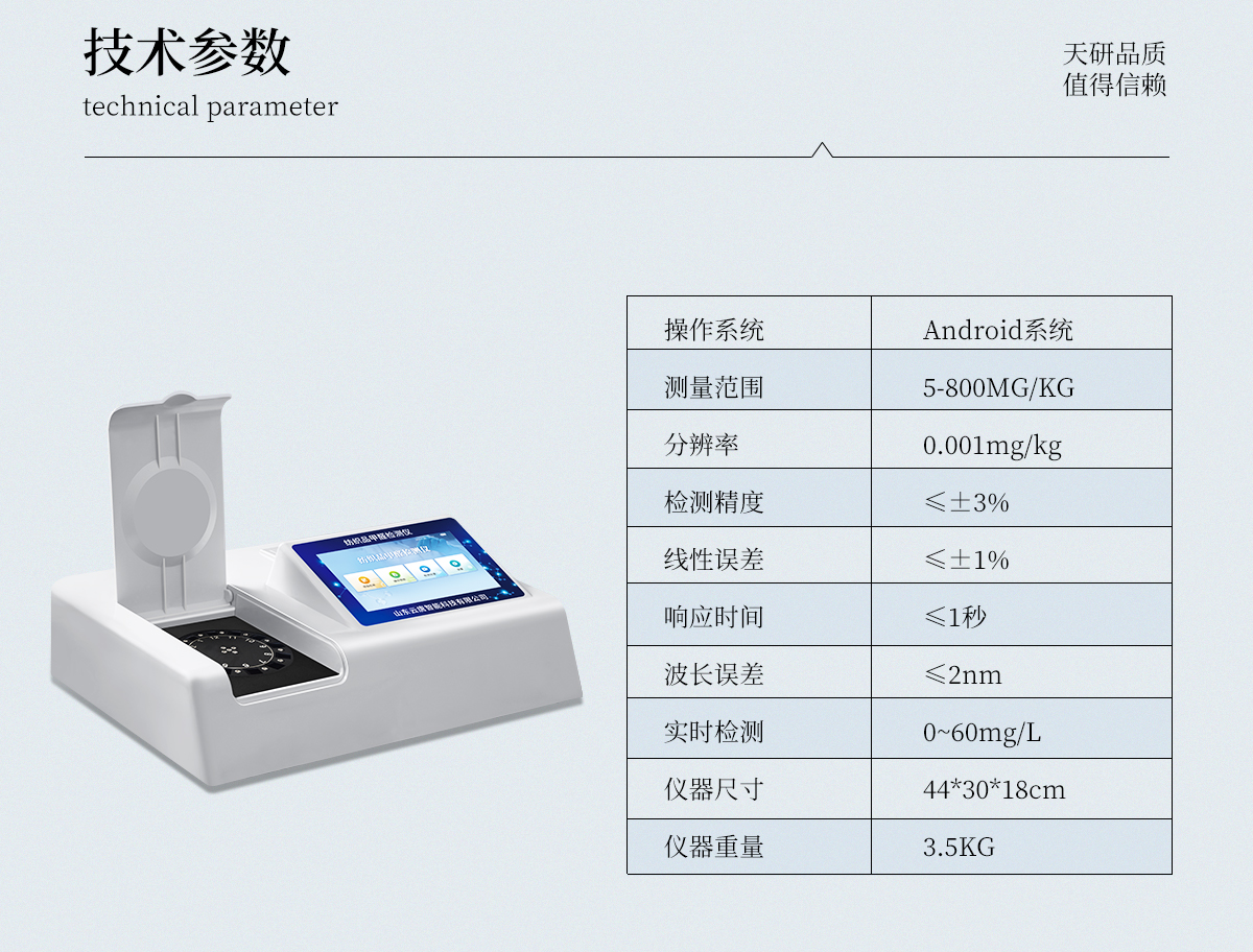 | 1、智能**且方便 | ①智能芯片:主控芯片采用ARM Cortex-A7,RK3288/4核處理器,搭配安卓智能操作系統,集實驗操作,分析結果,打印報告等功能于一體,使用方便,性能更強。 | ②大屏顯示:采用10.1英寸液晶觸摸屏,單機即可操作,無需連接外部顯示或控制器。 | ③多樣同檢:儀器具有12個檢測通道,可同時一次性檢測11個樣品,效率更高。 | ④工作預設:具有任務預設模塊,一鍵提前預設樣品所有信息內容。來樣時可直接檢測,同時可多次調取。 | ⑤數據分析:設備首頁自動匯總分析數據,并繪制柱形分析圖,各項檢測數據一目了然,快捷直觀。 | ⑥高度集成:模塊高度集合,將分光光度模塊、數字化管理模塊、無線通訊模塊集成于一體。可將檢測結果進行分析,直接上傳至數據平臺,實現數據共享,方便后期進行數據分析與統計。 | ⑦遠程升級:儀器具備遠程升級功能,可遠程升級程序,無需返廠,并可持續性免費更新系統版本,降低成本及運輸損耗風險。 | 2、檢測精準且直觀 | ①**技術:精密旋轉比色池,使用同芯片同光源校準精度,解決不同光源之間存在波長誤差的問題,更加準確**。 | ②結果直觀:儀器自動對檢測結果與國標限量值進行對比,自動判定結果是否合格,結果更直觀。 | 3、功能強大且實用 | ①存儲功能:設備可以存儲數據100000組,可在屏幕上直觀查看歷史數據,可導出數據。 | ②打印功能:設備自帶打印功能,可對樣品信息及檢測結果無限次隨意打印。 | ③全新方式:新創自定義打印方式,可按需靈活勾選控制:二維碼,抽樣信息、檢測信息,受檢信息、復核信息、抽樣日期、檢測日期等信息的打印 | ④多重編輯:樣品信息可多重編輯,可以對每個通道屬性和樣品信息單獨進行編輯,例如樣品信息、抽樣信息、檢測信息,受檢信息、復核信息、抽樣日期、檢測日期等信息等。 | ⑤雙語設計:全中文/英文操作菜單,簡單實用,適用于不同用戶的需求。 |