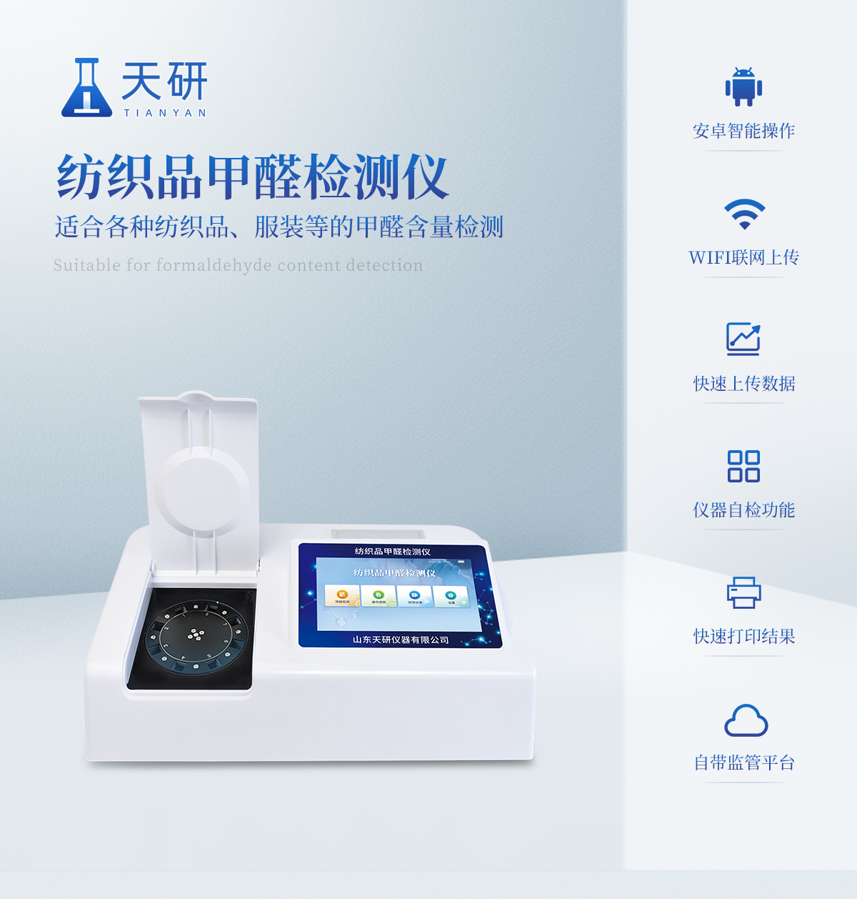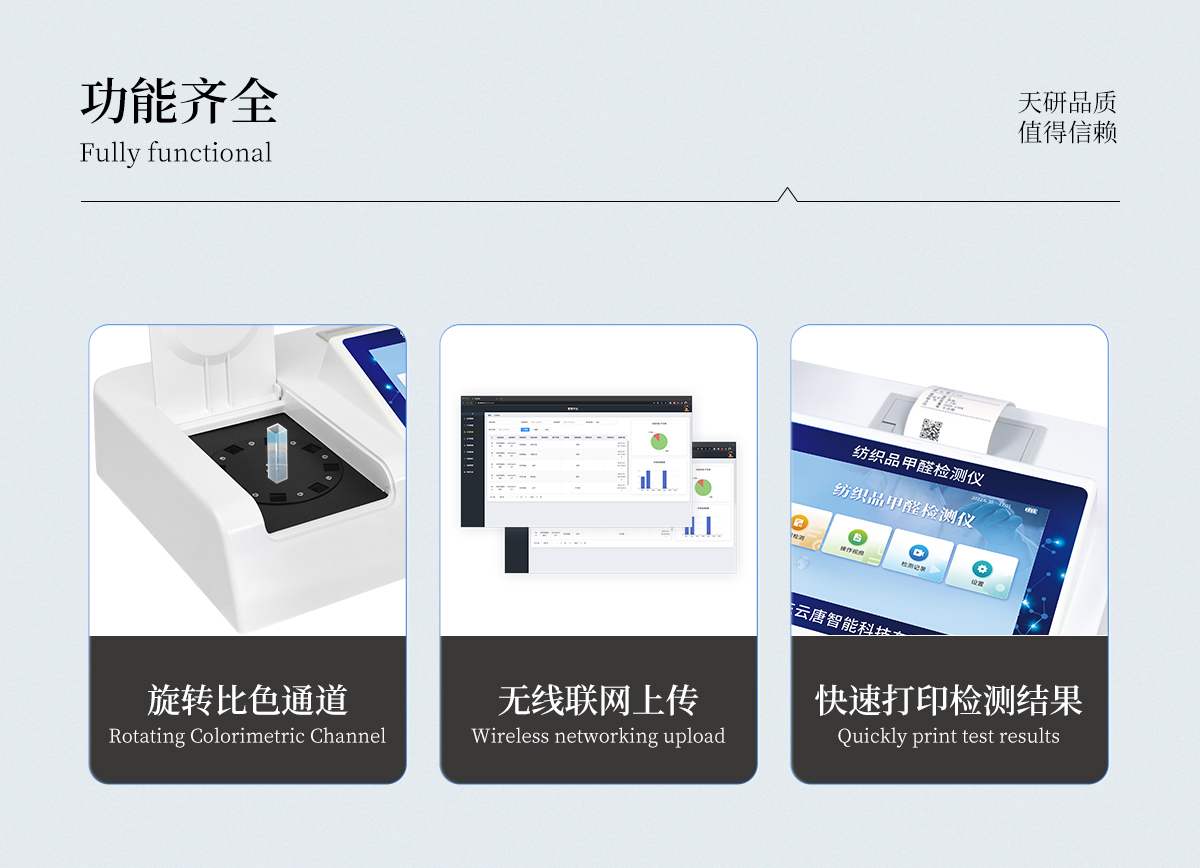 該紡織品甲醛檢測系統與質檢、商檢機構采用同樣執行標準、檢測方法,專業為廣大紡織品、服裝等生產企業、質檢商檢單位提供“一站式服務”,同時為各類紡織品甲醛實驗室提供專業的解決方案。