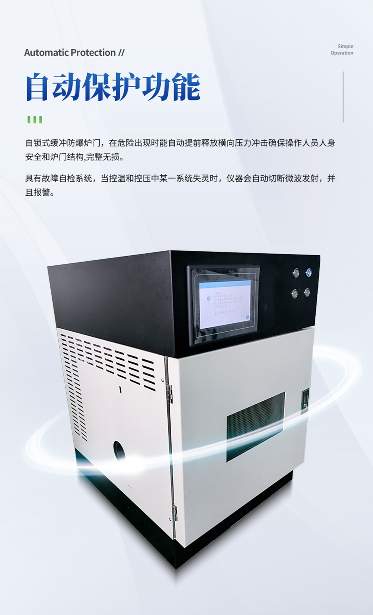 儀器采用微波非脈沖連續自動變頻控制,延長了儀器的使用壽命和電磁波的均勻性,腔體采用52L大容積316L不銹鋼腔體材料制成,自鎖式緩沖防爆爐門,當反應異常時,緩沖結構確保操作人員人身安全和爐門結構完整無損,爐門和腔體結合緊密,微波泄漏符合國家標準。儀器采用溫、壓雙控系統對消解實驗的壓力和溫度進行控制,實時顯示。360°同向連續旋轉,微波均勻,確定各個樣品微波環境相同,提高實驗結果的一致性。當罐內的壓力超過設定的保護值時,微波會自動停止加熱。安全防爆膜具有雙保險功能,當罐內的壓力超過防爆膜所能承受的壓力時,防爆膜先行破裂,氣體瀉出,防止罐體受損和對人體的傷害。