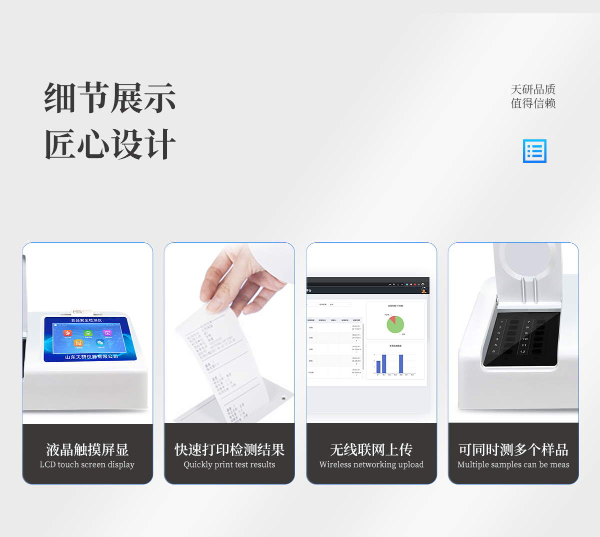 | 儀器采用臺式一體化系統檢測技術,將分光光度模塊、新型農殘檢測模塊、數字化管理模塊、無線通訊模塊高度集成于一體,支持檢測200種食品安全檢測項目,同時預留升級檢測方法。 | 儀器檢測模塊標準化、智能化,可隨意自由組合。檢測箱體內置多個標準檢測單元,檢測模塊可以調整配置。 | 儀器采用全新安卓智能系統,主控芯片采用 ARM Cortex-A7,RK3288/4核處理器,10.1寸高清液晶觸摸豎屏,更加**的UI交互界面,運轉快捷;儀器配備無線通信模塊: 4G(APN)通訊模塊、Wifi模塊,藍牙傳輸,同時具有雙USB接口以及RJ45接口能以多種方式實現數據保存和數據傳輸功能。 | 創新檢測模式: | ★檢測通道:≥12通道;采用精密旋轉比色池設計,使用同芯片同光源校準精度,解決不同光源之間的誤差值。1-12通道間誤差0.1%。(**號:ZL202022821055.2) | ★儀器具有自動識別比色皿檢測功能,即:將樣品比色皿放入儀器后,點擊樣品檢測,儀器自動識別比色皿進行通道檢測。 | 進口高精光源: | 高精度進口四波長冷光源,通道配置 410、520、590、630nm 波長光源,一個光源芯片驅動一個光源,誤差極小,每臺設備單獨**校準光源,**比對,同時參照四種不同波段光源全方位覆蓋市面上99%的農殘食品項目檢測。 | 智能化操作系統: | 便捷操作系統:設備檢測時可在同一檢測界面自動對應相關檢測通道一次性選擇1-12個樣品名稱,無須退出界面,節省操作時間。 | 數據集成系統:設備首頁自動統計檢測數據包含:周檢測數據、月檢測數據,全部檢測總數量,均包含檢測總數,合格數,不合格數,以及相關柱形分析圖,對各項檢測數據清晰掌握,無需電腦查詢,更加快捷直觀。 | 項目預設系統:支持添加單個及多個相同或不相同的任務預設,一鍵快速調取,每一個任務分別可以設置不同的樣品、批次、編號、來源、備注、抽樣信息、檢測信息、受檢信息、復核信息等更多信息。無縫鏈接平臺和APP實時查看下發任務。 | 數據監管系統:同步對接監管平臺,數據可局域網和互聯網數據上傳,檢測結果可選擇直接傳至食品安全監管平臺。集成OSS輸出存儲服務、區分設備定向管理應用,進行區域食品安全監管及大數據分析處理與數據統計,檢測區域食品安全長短期動態,達到食品安全問題預估、預警。 | 自定義打印系統:內置全新打印系統,新創自定義打印方式,可按需靈活設置開啟或關閉:產品合格證(國家農業部標準要求),二維碼,抽樣信息、檢測信息,受檢信息、復核信息、抽樣日期、檢測日期等信息的打印。 | 系統遠程更新功能:可定向分客戶分儀器更新系統,按照不同客戶后期實際需求添加項目,無需機器返廠,即可遠程實時升級全新系統,節省時間成本及避免運輸造成設備損壞。 | 儀器主機采用一體化防水、抗壓、防撞擊、防腐蝕箱體設計,同時配備交直流供電,可連接車載電源,可選配大容量充電鋰電池,滿足現場野外檢測需求。 | 安全證書,放心保障:儀器具有中國計量科學研究院校準證書,**認證。 |