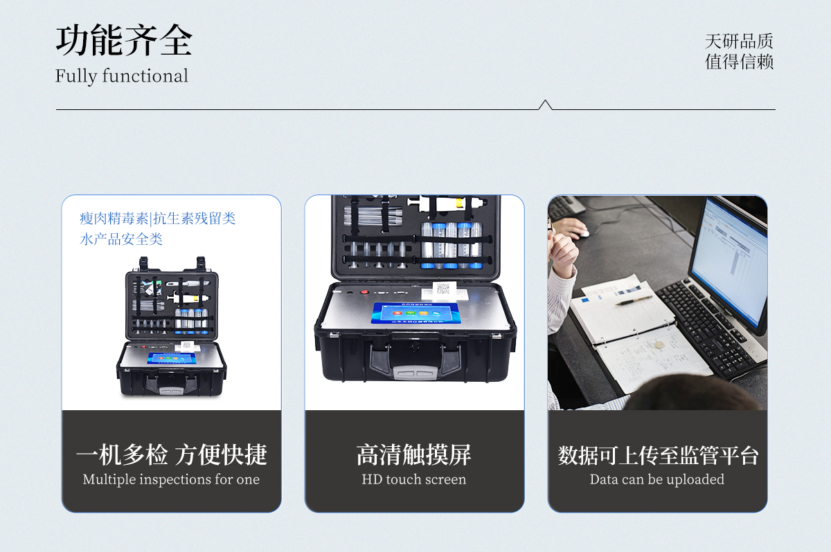 | 安卓智能操作系統,采用更加**UI交互界面,儀器具有wifi聯網上傳、4G聯網傳輸、GPRS無線遠傳、網線連接功能,快速批量上傳數據。 | 智能化程度高,儀器具有自檢功能:具有開機自檢和調零功能,具有自動檢測重復性功能。 | 新一代高速熱敏打印機,檢測完成可自動打印檢測報告和二維碼。 | 儀器帶有監管平臺,數據可局域網和互聯網數據上傳,檢測結果直接傳至食品安全監管平臺。進行區域食品安全監管及大數據分析處理與數據統計,檢測區域食品安全長短期動態,達到食品安全問題預估、預警 | 一體化便攜式快檢設備,滿足現場及流動檢測使用需求,能夠在同一軟件下實現所有檢測項目的檢測,并可通過同一窗口直觀顯示檢測結果。 | 膠體金模塊檢測方式:軌道式自動傳輸掃描,檢測完成后自動退出檢測卡。 | 一體化主機,包含食品安全檢測模塊、多通道農藥殘留檢測模塊、膠體金免疫層析檢測模塊。 | CT線自動識別,無需手動調整。 | 儀器具有品類多種類樣品菜單庫,可靈活選擇檢測樣品,不同的檢測通道可同時檢測不同的樣品項目。。 | 樣品處理簡單省力,整體操作快速、安全、便捷。 | 儀器具有自身保護功能,可設置用戶名及密碼,防止非工作人員操作等。 | 高靈敏度,高檢測精度,高重復性精度,掃描式高精度光學傳感器。 | 儀器具有重新校準、鎖定、恢復出廠設置功能。 | 內置強大的數據庫,可在儀器上直接選擇樣品名稱、檢測指標、送檢單位等信息,也可在儀器上直接編輯錄入樣品名稱、檢測指標、送檢單位等信息并保存進樣品數據庫。 | 儀器具有重新校準、鎖定、恢復出廠設置功能。 | 結果判定線可修改,對照值標定值可保存,斷電不丟失數據。 | 兼容市場上所有的膠體金卡,使用耗材不受限制,極大增強用戶使用體驗。 |