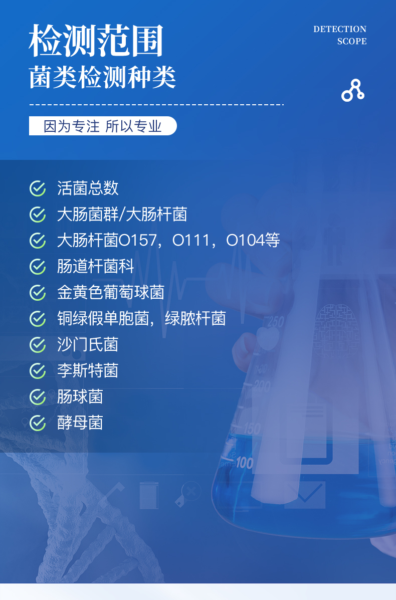 | 活細菌總數(shù) :大腸菌群/糞大腸菌群/大腸桿菌/大腸桿菌O157, O111, O104...等 | 腸道桿菌科 :金黃色葡萄球菌 銅綠假單胞菌;綠膿桿菌 沙門氏菌 李斯特菌 腸球菌 酵母菌 |