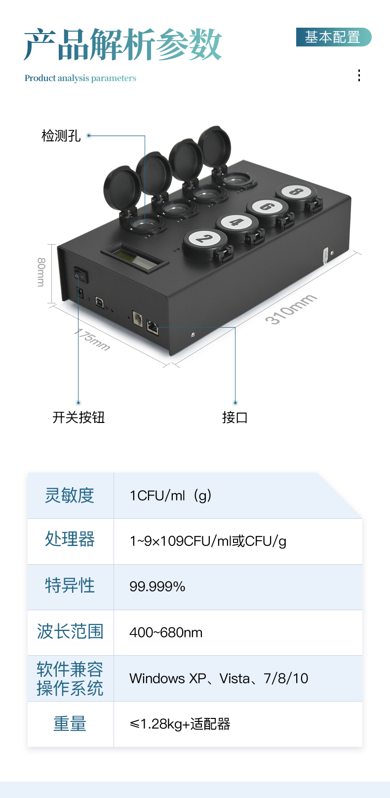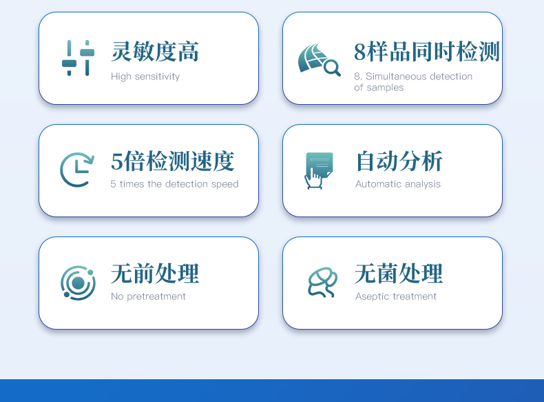 4、 檢測樣本只需1ml/1g;同一溫度下可同時檢測8個樣品;