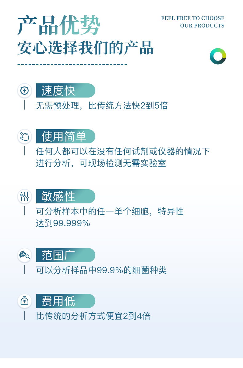 5、 靈敏度高達可檢測到1目標微生物;特異性高達99.999%;