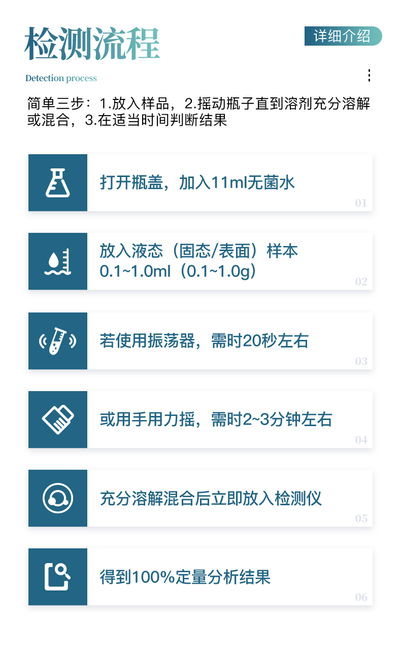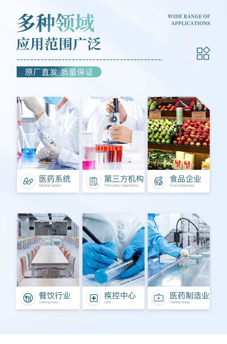 | 衛(wèi)生控制: -食品(HACCP) -廚房、工具、表面(HACCP) -水質(zhì) -(CDC)疾病控制、進出口檢驗檢疫 -藥品及 化妝品 | 與我們的生活息息相關(guān),例如: 咖啡館、餐廳 ,水源檢測、制水廠 ,分析實驗室和HACCP診斷 ,農(nóng)產(chǎn)品及相關(guān)加工公司 ,藥廠、藥房、化妝品廠 ,環(huán)境監(jiān)測機構(gòu) ,水配送公司 ,消費者保護團體、工商管理機構(gòu) ,室內(nèi)空調(diào)調(diào)節(jié)公司 | 集傳統(tǒng)檢驗方法優(yōu)點于一身:培養(yǎng)皿法、 酶法(β-葡萄糖苷酸酶分析)、 -免疫法(抗原搜尋)、基因法(基因搜尋) | 檢驗樣本無需任何前處理 :-液態(tài)樣本,固態(tài)樣本和表面樣本均無需前處理 ; | 定性和定量分析 :-搭配檢測機:100%的定量分析 、肉眼判讀:定性或半定量分析 ; | 簡單便捷 :簡單的三個步驟得到檢測結(jié)果 ; | 檢驗迅速 :是傳統(tǒng)檢驗方法速度的2~5倍 ; | 高靈敏性:可以檢測到1目標微生物(理論極值); | 高特異性 :特異性高達99.999%(理論極值) ; | 檢測瓶就是實驗室 :微生物檢測瓶隨時可用、未受過嚴格專業(yè)訓練的檢測人員也可隨時隨地進行檢測 ; | 使用后安全丟棄 :和過期藥物同樣處理 ; |