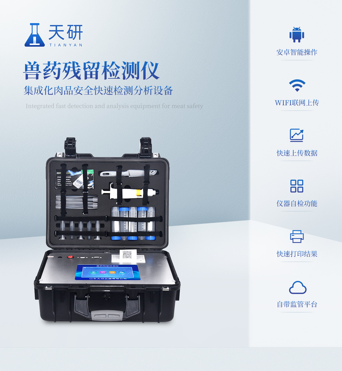| 安卓智能操作系統,采用更加**和人性化操作,儀器具有網線連接、wifi聯網上傳、4G無線遠傳功能,快速上傳數據。 | 智能化程度高,儀器具有自檢功能:具有開機自檢和調零功能,具有自動檢測重復性功能。 | 新一代高速熱敏打印機,檢測完成可自動打印檢測報告和二維碼。 | 儀器帶有監管平臺。數據可局域網和互聯網數據上傳,檢測結果直接傳至食品安全監管平臺。進行區域食品安全監管及大數據分析處理與數據統計,檢測區域食品安全長短期動態,達到食品安全問題預估、預警。 | 一體化便攜式快檢設備,滿足現場及流動檢測使用需求,能夠在同一軟件下實現所有檢測項目的檢測,并可通過同一窗口直觀顯示檢測結果。 | 膠體金模塊檢測方式:軌道式自動傳輸掃描,檢測完成后自動退出檢測卡。 | CT線自動識別,無需手動調整。 | 儀器具有品類多種類樣品菜單庫,可靈活選擇檢測樣品,不同的檢測通道可同時檢測不同的樣品項目。 | 樣品處理簡單省力,整體操作快速、安全、便捷。 | 儀器具有自身保護功能,可設置用戶名及密碼,防止非工作人員操作等。 | 高靈敏度,高檢測精度,高重復性精度,掃描式高精度光學傳感器。 | 內置強大的數據庫,可在儀器上直接選擇樣品名稱、檢測指標、送檢單位等信息,也可在儀器上直接編輯錄入樣品名稱、檢測指標、送檢單位等信息并保存進樣品數據庫。 | 儀器具有重新校準、鎖定、恢復出廠設置功能。 | 支持U盤存儲。 結果判定線可修改,對照值標定值可保存,斷電不丟失數據。 | 兼容市場上所有的膠體金卡,使用耗材不受限制,極大增強用戶使用體驗。 |