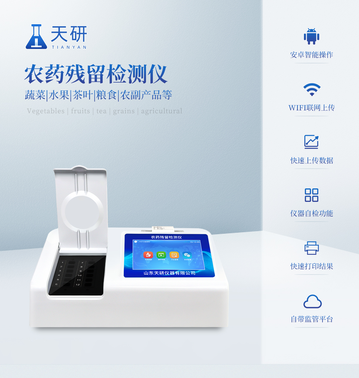 乙酰膽堿酯酶和丁酰膽堿酯酶試劑均可以使用,符合國家標準和農業部標準的要求。 自動判斷樣品是否合格,檢測結果更加直觀。儀器具有100多種蔬菜名稱菜單庫,分類管理,并可按需添加或刪除蔬菜名,編輯蔬菜名稱,可直接打印出蔬菜名稱。 檢測通道:12個檢測通道,可以同時測試多個樣品,循環檢測,即放即檢,每個樣品由程序控制分別獨立工作,不會互相干擾。智能操作系統,采用更加人性化操作,主控采用多核處理器,主頻1.88Ghz,運轉速度更快速,穩定性更強。 顯示方式:7英寸高靈敏真彩觸摸屏顯示,人性化中文操作界面,讀數直觀、簡單。打印機采用串口5v打印,可選擇手動打印或者自動打印,三分鐘出打印結果,打印格式為檢測人姓名、吸光度差值、檢測時間、檢測機構、樣品名稱及結果判定。 光源采用進口超高亮發光二極管,具有低功耗、高精度、穩定性強、光源可控可以關掉不使用的光源,響應速度快等優點。智能恒流穩壓,光強自動校準,長時間連續工作光源無溫漂現象。 儀器具有GPRS遠傳功能,可插手機卡實現數據遠傳平臺,wifi聯網功能,可將數據快速上傳電腦,進行數據管理與統計。采用USB2.0接口設計,方便數據的存貯和移動,并可隨時與計算機直接相連,并且可用計算機控制儀器。實現數據查詢、瀏覽、分析、統計、打印等。 智能化程度高,儀器具有自檢功能:具有開機自檢和調零功能,具有自動檢測重復性功能儀器具有自身保護功能,可設置用戶名及密碼,防止非工作人員操作等。 采用DC12v直流供電,安全系統更高,并且配備6A鋰電池充電器。儀器具有重新校準、鎖定、恢復出廠設置功能。