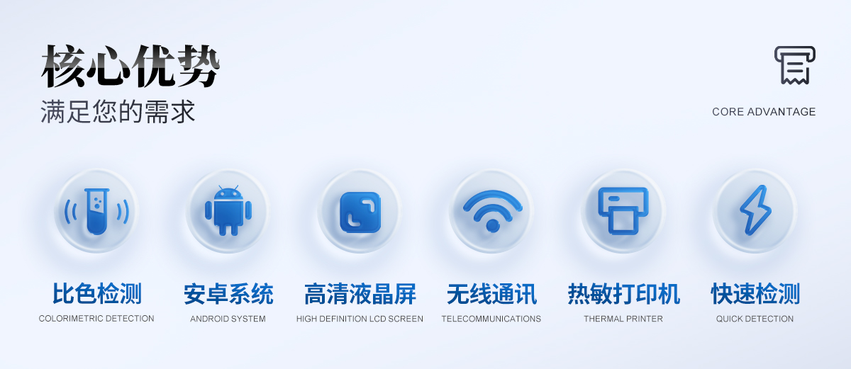 | 檢測方法:光電比色 | 測試模式:濃度 | 波長范圍:340~800nm | 系統:安卓智能操作系統 | 波長選擇:自動 | 顯示屏幕:3.5寸彩色液晶屏 | 穩定性:<0.5% | 靈 敏 度(吸光度):0.001 | 使用環境:0~50℃ 0~90%的相對濕度 | 數據存儲:80000條以上 | 通訊:Type-C、WIFI、藍牙 | 電池:5600mAh鋰電池 | 連續工作時間:12小時 | 供電電壓:5V/DC直流 | 尺寸:18cm*8cm | 重量:700g | 支持語言:簡體中文或英文 |