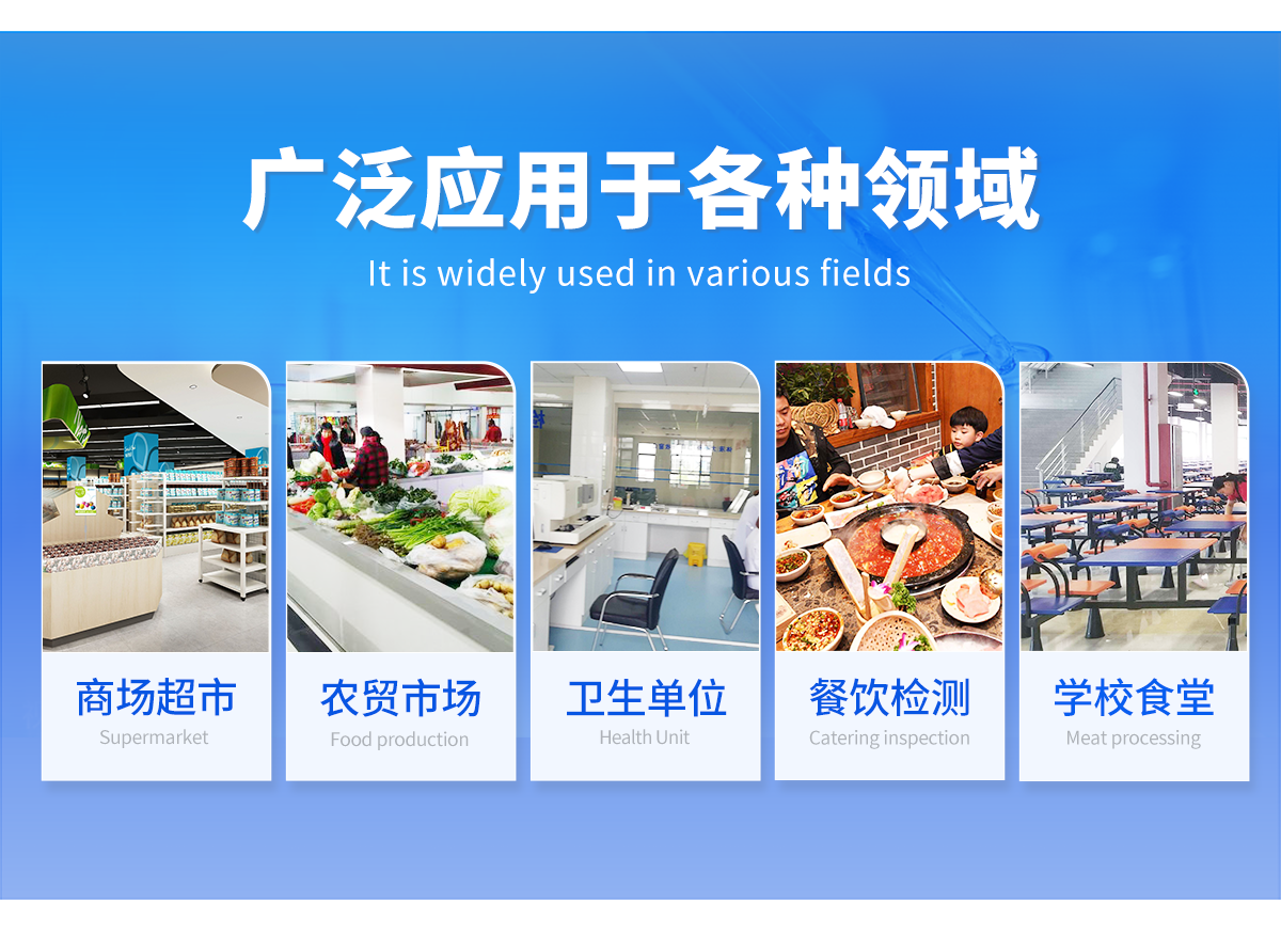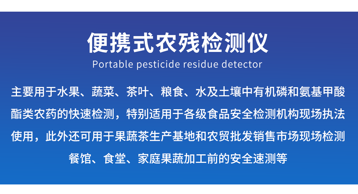主要用于水果、蔬菜、茶葉、糧食、水及土壤中有機(jī)磷和氨基甲酸酯類農(nóng)藥的快速檢測,特別適用于各級食品安全檢測機(jī)構(gòu)現(xiàn)場執(zhí)法使用,此外還可用于果蔬茶生產(chǎn)基地和農(nóng)貿(mào)批發(fā)銷售市場現(xiàn)場檢測,餐館、食堂、家庭果蔬加工前的安全速測等