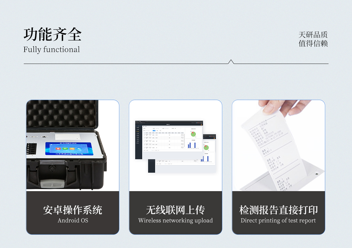 | 隨著人民生活水平的不斷提升,市場對茶葉的把控愈加嚴(yán)格。針對現(xiàn)狀,我司專門研發(fā)生產(chǎn)--茶葉專用的農(nóng)藥殘留速測儀;定位茶農(nóng)、茶商、茶葉企業(yè)使用。 此外還可用于果蔬茶生產(chǎn)基地和農(nóng)貿(mào)批發(fā)銷售市場現(xiàn)場檢測,餐館、學(xué)校、食堂、家庭果蔬加工前的安全速測等。 | 檢測通道: 5個檢測通道,可以同時測試多個樣品,每個樣品由程序控制分別獨(dú)立工作,不會互相干擾。 | 顯示方式:≥5英寸液晶觸摸屏顯示,人性化中文操作界面,讀數(shù)直觀、簡單。 | 配備嵌入式高速熱敏打印機(jī),可選擇手動打印或者自動打印,三分鐘出打印結(jié)果。 | 光源采用進(jìn)口超高亮發(fā)光二極管,具有低功耗、穩(wěn)定性強(qiáng)、高靈敏度,高檢測精度,高重復(fù)性精度,光源可控、響應(yīng)速度快等優(yōu)點(diǎn)。 | 采用標(biāo)準(zhǔn)USB接口設(shè)計(jì),免驅(qū)動安裝,方便數(shù)據(jù)的存貯和移動,并可隨時與計(jì)算機(jī)直接相連,并且可用計(jì)算機(jī)控制儀器。實(shí)現(xiàn)數(shù)據(jù)查詢、瀏覽、分析、統(tǒng)計(jì)、打印等。 | 智能化程度高,儀器具有自檢功能:具有開機(jī)自檢和調(diào)零功能,具有自動檢測重復(fù)性功能 | 內(nèi)置強(qiáng)大的數(shù)據(jù)庫,可在儀器上直接選擇樣品名稱、檢測指標(biāo)、送檢單位等信息,也可在儀器上直接編輯錄入樣品名稱、檢測指標(biāo)、送檢單位等信息并保存進(jìn)樣品數(shù)據(jù)庫。 | 支持Wifi網(wǎng)絡(luò),數(shù)據(jù)可局域網(wǎng)和互聯(lián)網(wǎng)數(shù)據(jù)上傳,檢測結(jié)果直接傳至食品安全監(jiān)管平臺。進(jìn)行區(qū)域食品安全監(jiān)管及大數(shù)據(jù)分析處理,檢測區(qū)域食品安全長短期動態(tài),達(dá)到食品安全問題預(yù)估、預(yù)警 |