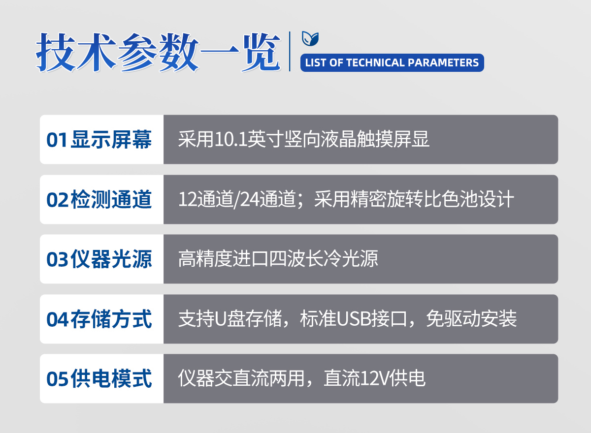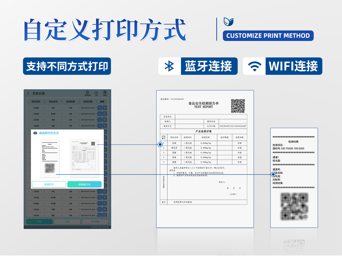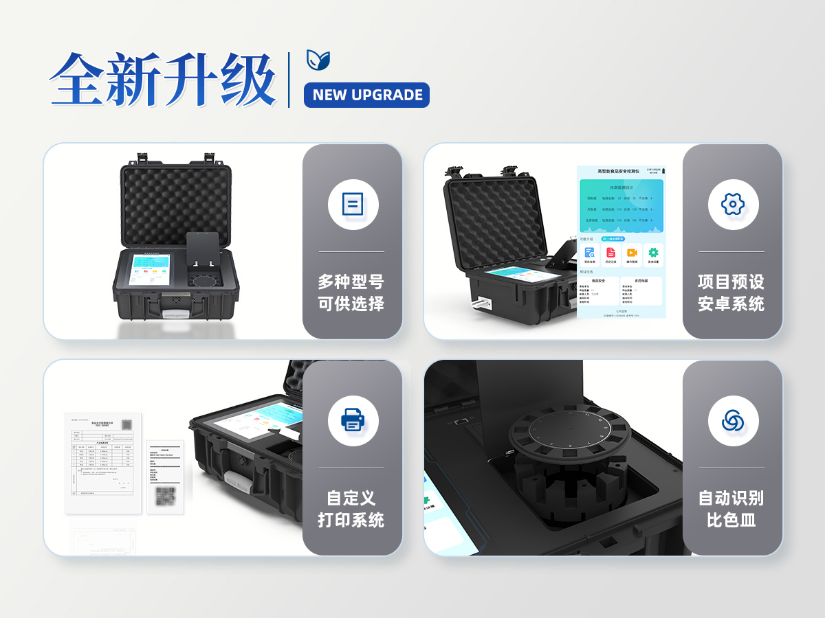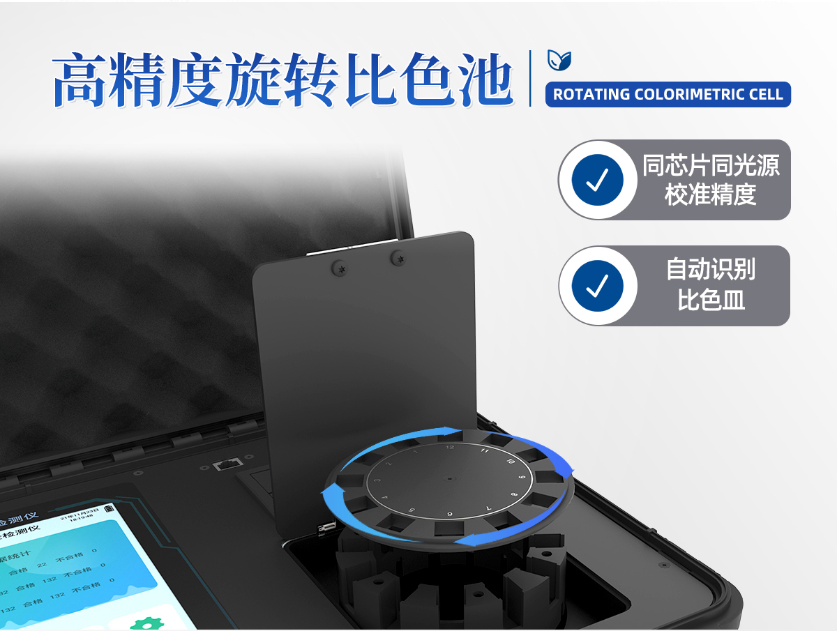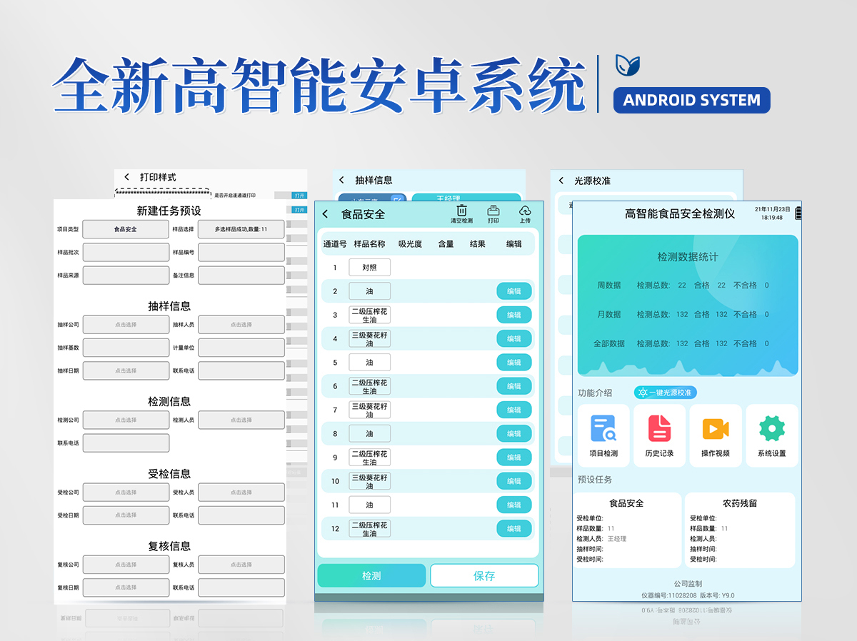 | 儀器采用手提式一體化系統(tǒng)檢測(cè)技術(shù),將分光光度模塊、膠體金檢測(cè)模塊、新型農(nóng)殘檢測(cè)模塊、數(shù)字化管理模塊、無(wú)線通訊模塊高度集成于一體,支持檢測(cè)200種食品安全檢測(cè)項(xiàng)目,同時(shí)預(yù)留升級(jí)檢測(cè)方法。 | 儀器檢測(cè)模塊標(biāo)準(zhǔn)化、智能化,檢測(cè)項(xiàng)目可隨意自由組合。檢測(cè)箱體內(nèi)置多個(gè)標(biāo)準(zhǔn)檢測(cè)單元,檢測(cè)模塊可以調(diào)整配置。 | 顯示屏幕:儀器采用10.1英寸豎向液晶觸摸屏顯,搭配運(yùn)行安卓智能操作系統(tǒng),主控芯片采用ARM Cortex-A7,RK3288/4核處理器,主頻1.88Ghz,操作方便,性能更強(qiáng)。 | 檢測(cè)通道:≥12通道;采用精密旋轉(zhuǎn)比色池設(shè)計(jì),使用同芯片同光源校準(zhǔn)精度,解決不同光源之間的誤差值,更加準(zhǔn)確**。(1-12通道間誤差0.1%,**號(hào):ZL202022821055.2) | 儀器光源:高精度進(jìn)口四波長(zhǎng)冷光源,每個(gè)通道均配置 410、520、590、630nm 波長(zhǎng)光源,標(biāo)配**的光路切換裝置,**光路切換功能可實(shí)現(xiàn)64波長(zhǎng),并且所有檢測(cè)項(xiàng)目可實(shí)現(xiàn)所有通道同時(shí)檢測(cè)。 | 設(shè)備可一鍵校準(zhǔn),自動(dòng)保存校準(zhǔn)數(shù)據(jù),自動(dòng)對(duì)比校驗(yàn),得到精準(zhǔn)光源,采用Android SP存儲(chǔ)數(shù)據(jù),光源數(shù)據(jù)永不丟失,方便每一次使用。 | 通訊接口:配備無(wú)線通信模塊、4G(APN)通訊模塊、藍(lán)牙傳輸,同時(shí)具有雙USB接口以及RJ45網(wǎng)線接口,可以多方式實(shí)現(xiàn)數(shù)據(jù)保存及數(shù)據(jù)傳輸。 | 存儲(chǔ)方式:支持U盤(pán)存儲(chǔ),標(biāo)準(zhǔn)USB接口,免驅(qū)動(dòng)安裝。檢測(cè)結(jié)果存儲(chǔ)容量20萬(wàn)條以上,可生成Excel表格進(jìn)行拷貝,并具有登錄保護(hù)功能。 | 智能化操作系統(tǒng):: ★操作系統(tǒng):儀器可在同一檢測(cè)界面自動(dòng)對(duì)應(yīng)相關(guān)檢測(cè)通道,一次性選擇1-12個(gè)樣品名稱,無(wú)需退出界面,節(jié)省操作時(shí)間。并可以對(duì)每個(gè)通道屬性和樣品信息單獨(dú)進(jìn)行編輯,例如送檢單位、人員,檢測(cè)人員等,打印時(shí)勾選打印顯示。 | ★數(shù)據(jù)集成系統(tǒng):設(shè)備首頁(yè)自動(dòng)匯總分析檢測(cè)數(shù)據(jù),包含:周檢測(cè)數(shù)據(jù)、月檢測(cè)數(shù)據(jù),全部檢測(cè)總數(shù)量,均包含檢測(cè)總數(shù),合格數(shù),不合格數(shù),以及相關(guān)柱形分析圖,各項(xiàng)檢測(cè)數(shù)據(jù)一目了然,無(wú)需電腦查詢,更加快捷直觀。 | ★數(shù)據(jù)庫(kù)系統(tǒng):十幾項(xiàng)數(shù)據(jù)庫(kù)分類(lèi)管理儀器:包含項(xiàng)目類(lèi)型、項(xiàng)目數(shù)據(jù)、檢測(cè)數(shù)據(jù)、歷史記錄、國(guó)標(biāo)信息、曲線信息、采樣信息、檢測(cè)信息、受檢信息、復(fù)核信息、圖表信息、光源校準(zhǔn)信息、打印樣式信息、樣品庫(kù)信息等等,數(shù)據(jù)庫(kù)之間互相協(xié)調(diào)聯(lián)動(dòng)保證數(shù)據(jù)的真實(shí)完整性。同時(shí)產(chǎn)品數(shù)據(jù)庫(kù)以及歷史檢測(cè)記錄支持一鍵檢索功能。 | ★限量規(guī)判系統(tǒng):具有限量查詢、添加物質(zhì)合規(guī)判定系統(tǒng)。檢測(cè)出結(jié)果后,系統(tǒng)自動(dòng)調(diào)用系統(tǒng)數(shù)據(jù)庫(kù)中相關(guān)國(guó)標(biāo)進(jìn)行比對(duì)判定,客觀顯示判定結(jié)果是否合格 | ★項(xiàng)目預(yù)設(shè)系統(tǒng):儀器具有任務(wù)預(yù)設(shè)模塊,一鍵提前預(yù)設(shè),給出方便快捷的新檢測(cè)方案,每一個(gè)任務(wù)分別可以設(shè)置不同的樣品、批次、編號(hào)、來(lái)源、備注、抽樣信息、檢測(cè)信息、受檢信息、復(fù)核信息等更多信息。樣品送檢時(shí)一鍵調(diào)取保存信息,并可多次調(diào)取,大大提高檢測(cè)效率。 | ★數(shù)據(jù)監(jiān)管系統(tǒng):同步對(duì)接監(jiān)管平臺(tái),數(shù)據(jù)可局域網(wǎng)和互聯(lián)網(wǎng)數(shù)據(jù)上傳,檢測(cè)結(jié)果可選擇直接傳至食品安全監(jiān)管平臺(tái)。進(jìn)行區(qū)域食品安全監(jiān)管及大數(shù)據(jù)分析處理與數(shù)據(jù)統(tǒng)計(jì),檢測(cè)區(qū)域食品安全長(zhǎng)短期動(dòng)態(tài),達(dá)到食品安全問(wèn)題預(yù)估、預(yù)警。 | ★打印系統(tǒng):內(nèi)置全新打印機(jī),新創(chuàng)自定義打印方式,可按需靈活勾選控制:產(chǎn)品合格證(國(guó)家農(nóng)業(yè)部標(biāo)準(zhǔn)要求),二維碼,抽樣信息、檢測(cè)信息,受檢信息、復(fù)核信息、抽樣日期、檢測(cè)日期等信息的打印。 | 供電模式:儀器交直流兩用,直流12V供電,可連接車(chē)載電源,可配6ah大容量充電鋰電池,電量可實(shí)時(shí)顯示,方便戶外流動(dòng)測(cè)試。 | 膠體金檢測(cè)模塊:采用雙通道CMOS成像處理技術(shù)及膠體金免疫層析技術(shù),可同時(shí)讀取雙膠體金卡數(shù)據(jù),自動(dòng)采集、處理分析,將檢測(cè)結(jié)果顯示,并可根據(jù)參考限值自動(dòng)判斷檢測(cè)結(jié)果,可檢測(cè)常見(jiàn)的獸藥殘留、生物毒素、抗生素、違禁添加物等。 | ★探測(cè)技術(shù):CMOS成像探測(cè); | ★檢測(cè)通道:1個(gè)通道; | ★檢測(cè)方式: