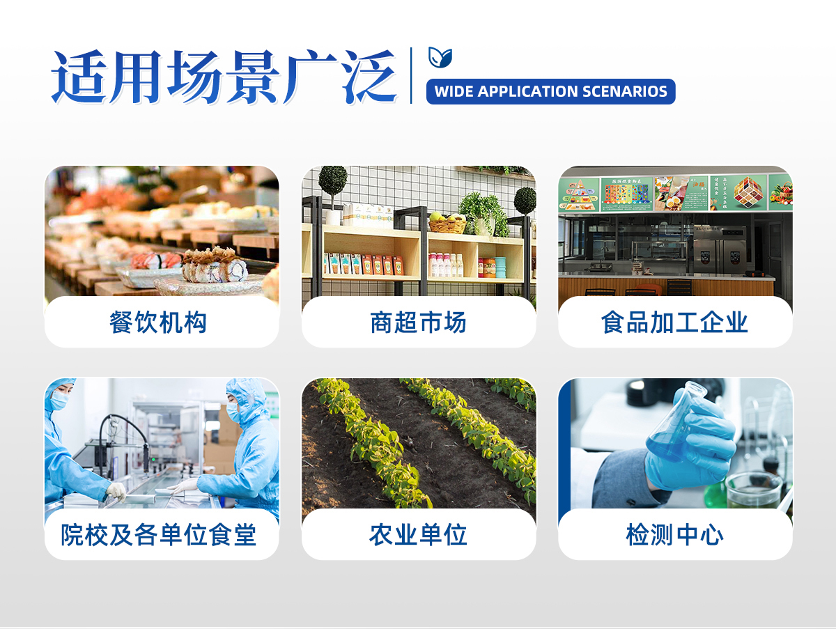 | 食品添加劑:二氧化硫、雙氧水、亞硝酸鹽、硝酸鹽、苯甲酸鈉、山梨酸鉀、糖精鈉、甜蜜素、木耳硫酸鎂等 | 有毒有害物質(zhì):甲醛、吊白塊、硼砂、過(guò)氧化苯甲酰、溴酸鉀、羅丹明B、三聚氰胺、蘇丹紅、工業(yè)堿、尿素、明礬等 | 果蔬:農(nóng)藥殘留(酶抑制率法) | 病害肉診斷:組胺、揮發(fā)性鹽基氮; | 重金屬含量:鉛、鎘、鉻、汞、砷、錫、鎳、鋁等; | 食用油脂: 過(guò)氧化值、酸價(jià)等 | 瘦肉精激素類(lèi)(獸藥):鹽酸克倫特羅、沙丁胺醇、萊克多巴胺、己烯雌酚等 | 抗生素殘留類(lèi)(獸藥):四環(huán)素類(lèi)、硝基呋喃類(lèi)、磺胺類(lèi)、β-興奮劑類(lèi)、沙星類(lèi)、磺胺類(lèi)、喹諾酮類(lèi),甲砜霉素,氟苯尼考,金剛烷胺、替米考星、慶大霉素、林可霉素、鏈霉素、恩諾沙星、環(huán)丙沙星、頭孢啦啶、青霉素、阿莫西林等 | 真菌毒素類(lèi):食用油、糧食及飼料中黃曲霉毒素B1、黃曲霉毒素總量,奶中黃曲霉毒素M1、嘔吐毒素、玉米赤霉烯酮、赭曲霉毒素A、T2毒素、伏馬毒素等; | 水酒飲品分析:酒中甲醇、乙醇、乳品及牛奶中蛋白質(zhì), | 調(diào)味品成分:食醋的總酸、醬油的總酸、芝麻油純度、谷氨酸鈉、醬油氨基酸態(tài)氮、食鹽中亞鐵氰化鉀、食鹽中碘等 | 食用色素類(lèi):紅色色素(胭脂紅、莧菜紅、赤蘚紅、誘惑紅)、黃色色素(檸檬黃、日落黃)、藍(lán)色色素(亮藍(lán))等 | 動(dòng)物疫病類(lèi):禽流感、新城疫、牛羊口蹄疫、牛羊結(jié)核病、牛羊包蟲(chóng)、牛羊布病、小反芻獸、豬藍(lán)耳病毒、豬瘟病毒、豬偽狂犬病毒、豬細(xì)小、豬圓環(huán)、犬細(xì)小病毒、犬瘟熱病毒、犬狂犬病毒等; | 蜂蜜成分:果糖和葡萄糖、蔗糖、淀粉酶、酸度等 | 水產(chǎn)品安全類(lèi):孔雀石綠、氯霉素、呋喃妥因、呋喃西林、呋喃它酮、呋喃唑酮等 | 蛋類(lèi)藥物殘留:氯霉素,四環(huán)素,磺胺類(lèi),喹諾酮類(lèi),呋喃西林,呋喃它酮,呋喃妥因,呋喃唑酮,氟苯尼考,阿莫西林、頭孢氨芐、紅霉素、鏈霉素等 |