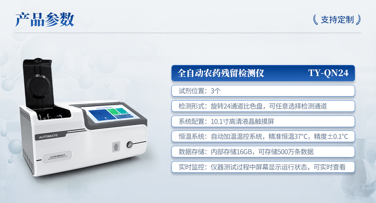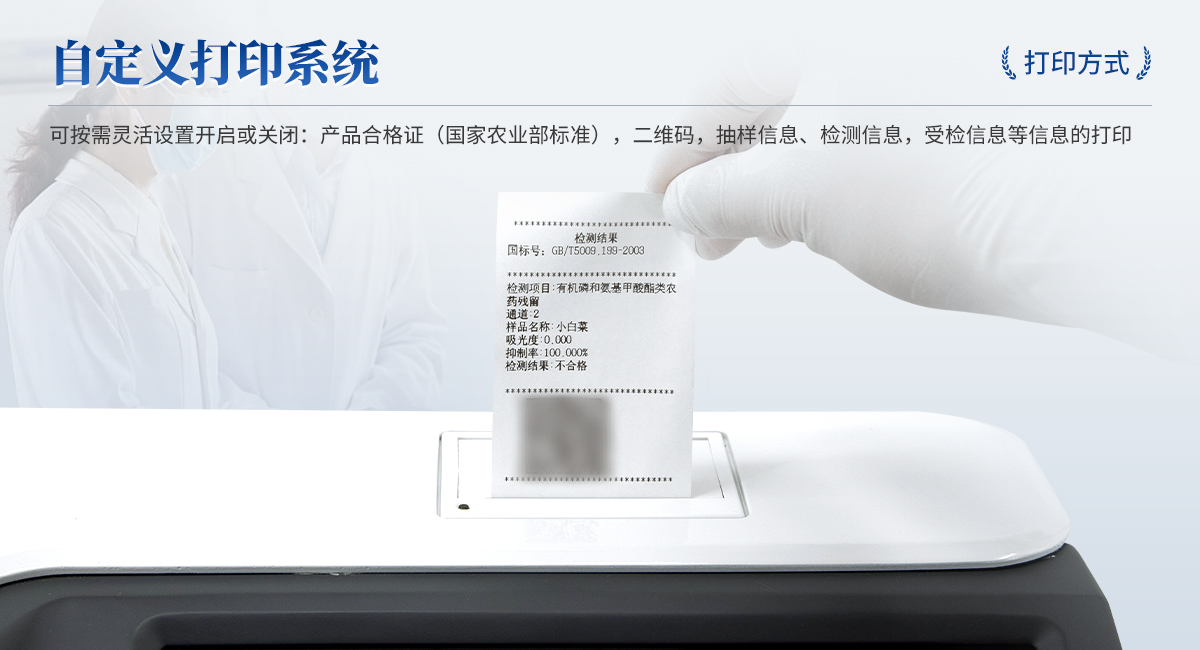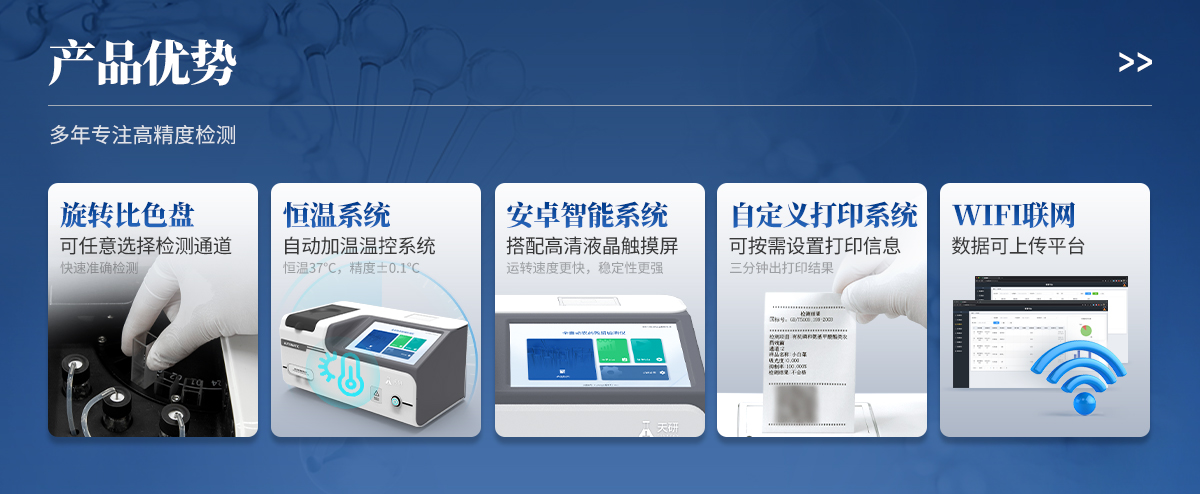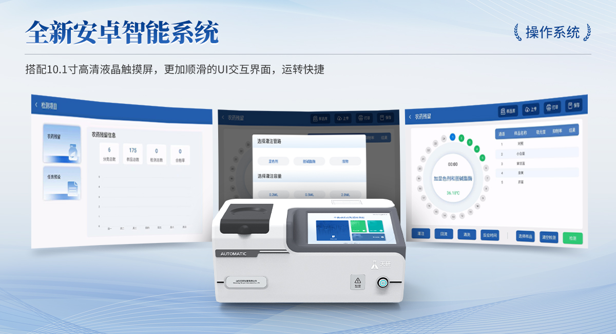| 1. 試劑位置:3個(gè) | 2. 檢測(cè)形式:旋轉(zhuǎn)24通道比色盤,可任意選擇檢測(cè)通道,自動(dòng)對(duì)應(yīng)選擇通道。 | 3. 系統(tǒng)配置:10.1寸高清液晶觸摸屏,采用ARM Cortex?-A7,RK3288/4核處理器,運(yùn)行內(nèi)存1GB。Android7.1.1 系統(tǒng)分辨率1280×800。 | 4.恒溫系統(tǒng):具有自動(dòng)加溫溫控系統(tǒng),精準(zhǔn)恒溫37℃,精度±0.1℃。 | 5.添加系統(tǒng):儀器按照試劑要求自動(dòng)、按時(shí)、按量加入試劑,并且自動(dòng)對(duì)未正常放置的樣本或異常的樣本進(jìn)行檢查并提示。 | 6.清洗功能:儀器具備回流及自動(dòng)清洗管路功能,避免試劑污染。 | 7.混勻功能:設(shè)備具備自動(dòng)混勻功能。 | 8.光源校準(zhǔn):設(shè)備可自動(dòng)校準(zhǔn),確保檢測(cè)準(zhǔn)確度。 | 9.實(shí)時(shí)監(jiān)控:儀器測(cè)試過(guò)程中屏幕顯示運(yùn)行狀態(tài),可實(shí)時(shí)查看。 | 10.數(shù)據(jù)存儲(chǔ):內(nèi)部存儲(chǔ)16GB,可存儲(chǔ)500萬(wàn)條數(shù)據(jù)。 | 11.樣品多選功能:設(shè)備具備樣品一鍵多選功能,選擇樣品自動(dòng)匹配檢測(cè)通道。 | 12.項(xiàng)目預(yù)設(shè):可提前設(shè)置單個(gè)及多個(gè)相同或不相同的檢測(cè)任務(wù),可單次或者多次調(diào)取,減少檢測(cè)時(shí)間。 | 13.自定義打印系統(tǒng):內(nèi)置自定義打印系統(tǒng),可按需靈活設(shè)置開(kāi)啟或關(guān)閉:產(chǎn)品合格證(國(guó)家農(nóng)業(yè)部標(biāo)準(zhǔn)),二維碼,抽樣信息、檢測(cè)信息,受檢信息等信息的打印。 | 14.A4版本報(bào)告打印功能:設(shè)備可自動(dòng)生成A4版報(bào)告,A4報(bào)告帶二維碼,可掃描二維碼生成電子版,并可識(shí)別真?zhèn)巍?/td> | 15.傳輸方式:儀器配備無(wú)線通信模塊: 4G(APN)通訊模塊、Wifi模塊,藍(lán)牙傳輸模塊,同時(shí)具有USB接口以及RJ45接口能以多種方式實(shí)現(xiàn)數(shù)據(jù)保存和數(shù)據(jù)傳輸功能,設(shè)備數(shù)據(jù)可以同步上傳至平臺(tái)。 | 16.數(shù)據(jù)監(jiān)管系統(tǒng):設(shè)備自帶監(jiān)管平臺(tái),并可同步對(duì)接監(jiān)管平臺(tái),數(shù)據(jù)可局域網(wǎng)和互聯(lián)網(wǎng)數(shù)據(jù)上傳,檢測(cè)結(jié)果可直接傳至食品安全監(jiān)管平臺(tái)。達(dá)到食品安全問(wèn)題預(yù)估、預(yù)警。 | 17.系統(tǒng)遠(yuǎn)程更新功能:無(wú)需設(shè)備返廠,即可遠(yuǎn)程實(shí)時(shí)升級(jí)全新系統(tǒng),節(jié)省時(shí)間成本及避免運(yùn)輸造成設(shè)備損。 |