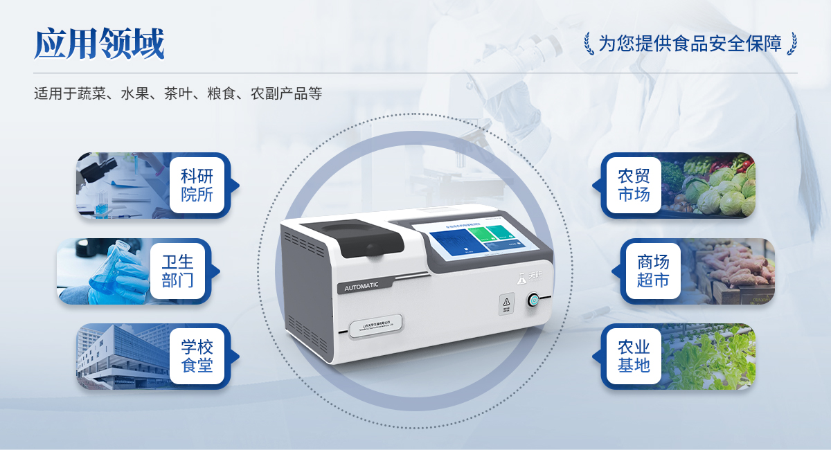 全自動(dòng)農(nóng)藥殘留檢測(cè)儀是依據(jù)國(guó)家標(biāo)準(zhǔn)方法(GB/T5009.199-2003),采用酶抑制率比色法對(duì)水果、蔬菜等農(nóng)產(chǎn)品中有機(jī)磷和氨基甲酸酯類農(nóng)藥含量進(jìn)行快速準(zhǔn)確的檢測(cè)。該設(shè)備廣泛應(yīng)用于蔬菜批發(fā)市場(chǎng)、超市、商場(chǎng)、食藥監(jiān)等部門的蔬菜和水果中的農(nóng)藥殘留檢測(cè)。