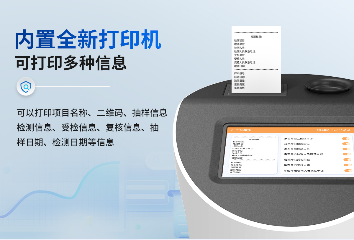 | 1.儀器采用7英寸液晶觸摸屏,搭配運行安卓智能操作系統(tǒng),主控芯片采用ARM Cortex-A7,RK3288/4核處理器,主頻1.88Ghz,操作方便,性能更強。 | 2.儀器采用智能化控制,可一鍵自動測量蛋重、蛋白高度、新鮮度(哈夫單位)、蛋黃高度、蛋殼厚度。 | 3.高精度數(shù)字傳感器,測量結(jié)果精度高,穩(wěn)定性好。 | 4.創(chuàng)新采用高精超聲波傳感器測試蛋白高度,精密傳感器測試蛋黃顏色,無需直接接觸蛋液,減少誤差存在。 | 5.儀器測試性能穩(wěn)定,不受操作人員的能力影響,方便簡單。 | 6.可一鍵自動測量哈夫單位、蛋重、蛋白高度、蛋黃高度和蛋殼厚度,把測試時間縮短到 17 秒。 | 7.儀器可本機存儲數(shù)據(jù),可連接USB端口將數(shù)據(jù)導(dǎo)出存儲。另外,儀器自帶數(shù)據(jù)上傳模塊,具有WIFI聯(lián)網(wǎng)上傳、RJ45網(wǎng)線連接功能,數(shù)據(jù)可實現(xiàn)局域網(wǎng)和互聯(lián)網(wǎng)數(shù)據(jù)上傳,檢測結(jié)果可選擇直接傳至數(shù)據(jù)平臺,進行大數(shù)據(jù)分析處理與數(shù)據(jù)統(tǒng)計,達到長期分析監(jiān)測的目的。 | 8.打印系統(tǒng):內(nèi)置全新打印機,可以打印項目名稱、二維碼、抽樣信息、檢測信息、受檢信息、復(fù)核信息、抽樣日期、檢測日期等信息。 | 9.供電模式:儀器交直流兩用,直流12V供電(標配),可連接車載電源,亦可選配6ah大容量充電鋰電池,方便戶外流動測試。 | 10.儀器具有重新校準、鎖定功能。 | 11.檢測指標: | (1)蛋白高度測量范圍:0.0~40.0mm,精度:0.1mm ; | (2)蛋重測量范圍:0~250g,精度:0.1g ; | (3) Haugh unit 值范圍:0~130HU; | (4)**等級:AA:≥72,A:71~60,B:59~31,C:≤30; | (5)蛋殼厚度測量范圍:0.00~4.00mm,精度:0.01mm 。 | 12.外觀尺寸:340*290*238mm(長*寬*高),儀器重量:5.05kg。 |