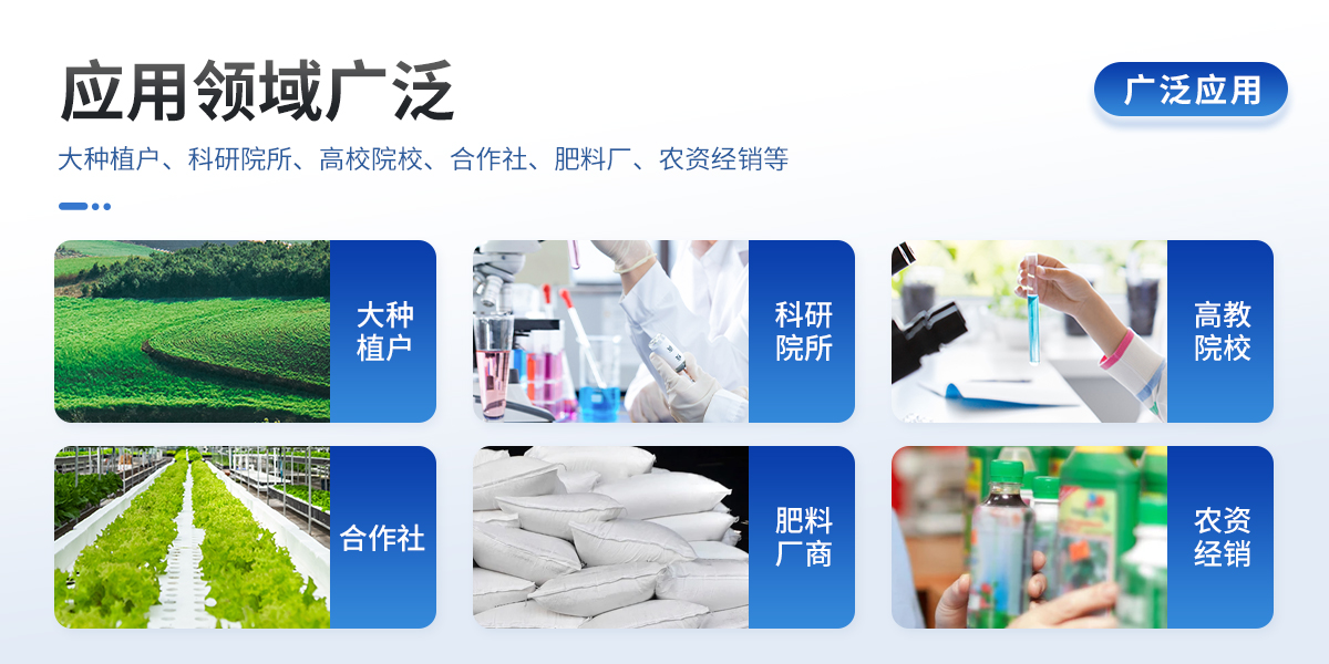 | 配套齊全:該儀器無需用戶自配附件,相當(dāng)于一個(gè)小型實(shí)驗(yàn)室。適于農(nóng)業(yè)服務(wù)部門或農(nóng)資經(jīng)銷商、合作社、肥料廠商、大種植戶測土施肥。 | 檢測功能全:測試項(xiàng)目國內(nèi)外全面,除標(biāo)配試劑外,其他各類藥劑均可加配選購。 | 操作簡便、速度快捷,配套整套附件及成品藥劑開瓶即用,無須配置。 |