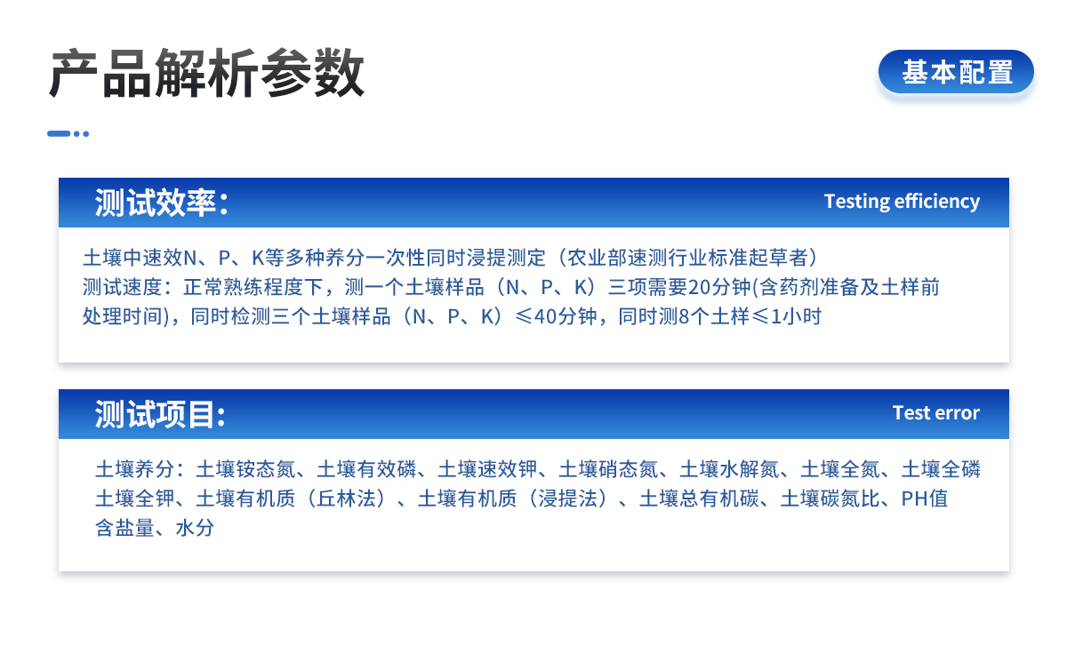 | 土壤中速效N、P、K等多種養(yǎng)分一次性同時(shí)浸提測定(農(nóng)業(yè)部速測行業(yè)標(biāo)準(zhǔn)起草者)。 | 測試速度:正常熟練程度下,測一個(gè)土壤樣品(N、P、K)三項(xiàng)需要20分鐘(含藥劑準(zhǔn)備及土樣前處理時(shí)間),同時(shí)檢測三個(gè)土壤樣品(N、P、K)≤40分鐘,同時(shí)測8個(gè)土樣≤1小時(shí)。 |