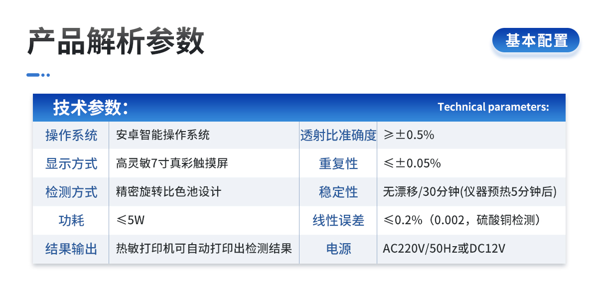 | 1.電源:交流 220±22V 直流 12V+5V(儀器內(nèi)置鋰電池也可用車載電源) | 2.功率: ≤5W | 3.量程及分辨率:0.001-9999 | 4.重復(fù)性誤差: ≤0.02%(0.0002,重鉻酸鉀溶液) | 5.儀器穩(wěn)定性:一個小時內(nèi)顯示數(shù)字無漂移(透光度測量);兩個小時內(nèi)數(shù)字漂移不超過0.3%(0.003,透光度測量)、0.001(吸光度測量)。 | 6.線性誤差: ≤0.1%(0.001,硫酸銅檢測) | 7.靈敏度:紅光≥4.5 ×10-5 藍(lán)光≥3.17×10-3 綠光≥2.35×10-3 橙光≥2.13×10-3 | 8.波長范圍 :紅光:680±2nm; 藍(lán)光:420±2nm; 綠光:510±2nm;橙光:590±4nm | 9.顯示屏分辨率:1024*600 | 10.抗震等級:IP65 | 11、儀器尺寸:48×34.5×22cm | 12、主機凈重:5.2kg |