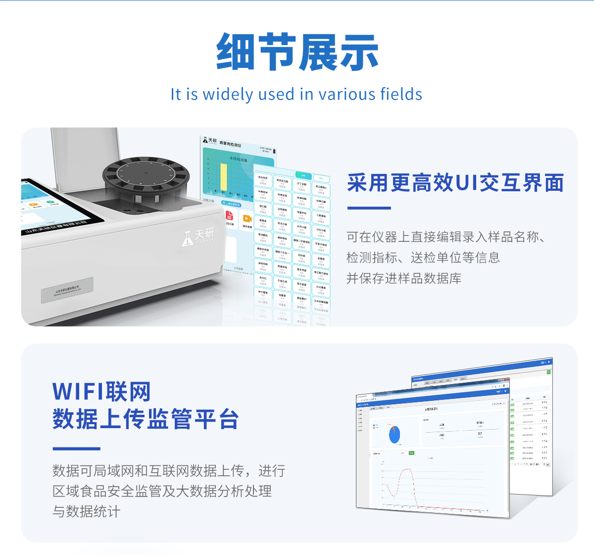 | 儀器采用手提式一體化系統(tǒng)檢測(cè)技術(shù),將分光光度模塊、新型農(nóng)殘檢測(cè)模塊、數(shù)字化管理模塊、無(wú)線(xiàn)通訊模塊高度集成于一體,支持檢測(cè)200種食品安全檢測(cè)項(xiàng)目,同時(shí)預(yù)留升級(jí)檢測(cè)方法。 | 儀器檢測(cè)模塊標(biāo)準(zhǔn)化、智能化,檢測(cè)項(xiàng)目可隨意自由組合。檢測(cè)箱體內(nèi)置多個(gè)標(biāo)準(zhǔn)檢測(cè)單元,檢測(cè)模塊可以調(diào)整配置。 | 顯示屏幕:儀器采用10.1英寸豎向液晶觸摸屏顯,搭配運(yùn)行安卓智能操作系統(tǒng),主控芯片采用ARM Cortex-A7,RK3288/4核處理器,主頻1.88Ghz,操作方便,性能更強(qiáng)。 | 檢測(cè)通道:≥12通道;采用精密旋轉(zhuǎn)比色池設(shè)計(jì),使用同芯片同光源校準(zhǔn)精度,解決不同光源之間的誤差值,更加準(zhǔn)確**。(1-12通道間誤差0.1%,**號(hào):ZL202022821055.2) | 儀器光源:高精度進(jìn)口四波長(zhǎng)冷光源,每個(gè)通道均配置 410、520、590、630nm 波長(zhǎng)光源,標(biāo)配**的光路切換裝置,**光路切換功能可實(shí)現(xiàn)64波長(zhǎng),并且所有檢測(cè)項(xiàng)目可實(shí)現(xiàn)所有通道同時(shí)檢測(cè)。 | 設(shè)備可一鍵校準(zhǔn),自動(dòng)保存校準(zhǔn)數(shù)據(jù),自動(dòng)對(duì)比校驗(yàn),得到精準(zhǔn)光源,采用Android SP存儲(chǔ)數(shù)據(jù),光源數(shù)據(jù)永不丟失,方便每一次使用。 | 通訊接口:配備無(wú)線(xiàn)通信模塊、4G(APN)通訊模塊、藍(lán)牙傳輸,同時(shí)具有雙USB接口以及RJ45網(wǎng)線(xiàn)接口,可以多方式實(shí)現(xiàn)數(shù)據(jù)保存及數(shù)據(jù)傳輸 | 存儲(chǔ)方式:支持U盤(pán)存儲(chǔ),標(biāo)準(zhǔn)USB接口,免驅(qū)動(dòng)安裝。檢測(cè)結(jié)果存儲(chǔ)容量20萬(wàn)條以上,可生成Excel表格進(jìn)行拷貝,并具有登錄保護(hù)功能。 | 智能化操作系統(tǒng): | 1)操作系統(tǒng):儀器可在同一檢測(cè)界面自動(dòng)對(duì)應(yīng)相關(guān)檢測(cè)通道,一次性選擇1-12個(gè)樣品名稱(chēng),無(wú)需退出界面,節(jié)省操作時(shí)間。并可以對(duì)每個(gè)通道屬性和樣品信息單獨(dú)進(jìn)行編輯,例如送檢單位、人員,檢測(cè)人員等,打印時(shí)勾選打印顯示。 | 2)數(shù)據(jù)集成系統(tǒng):設(shè)備首頁(yè)自動(dòng)匯總分析檢測(cè)數(shù)據(jù),包含:周檢測(cè)數(shù)據(jù)、月檢測(cè)數(shù)據(jù),全部檢測(cè)總數(shù)量,均包含檢測(cè)總數(shù),合格數(shù),不合格數(shù),以及相關(guān)柱形分析圖,各項(xiàng)檢測(cè)數(shù)據(jù)一目了然,無(wú)需電腦查詢(xún),更加快捷直觀。 | 3)數(shù)據(jù)庫(kù)系統(tǒng):十幾項(xiàng)數(shù)據(jù)庫(kù)分類(lèi)管理儀器:包含項(xiàng)目類(lèi)型、項(xiàng)目數(shù)據(jù)、檢測(cè)數(shù)據(jù)、歷史記錄、國(guó)標(biāo)信息、曲線(xiàn)信息、采樣信息、檢測(cè)信息、受檢信息、復(fù)核信息、圖表信息、光源校準(zhǔn)信息、打印樣式信息、樣品庫(kù)信息等等,數(shù)據(jù)庫(kù)之間互相協(xié)調(diào)聯(lián)動(dòng)保證數(shù)據(jù)的真實(shí)完整性。同時(shí)產(chǎn)品數(shù)據(jù)庫(kù)以及歷史檢測(cè)記錄支持一鍵檢索功能。 | 4)限量規(guī)判系統(tǒng):具有限量查詢(xún)、添加物質(zhì)合規(guī)判定系統(tǒng)。檢測(cè)出結(jié)果后,系統(tǒng)自動(dòng)調(diào)用系統(tǒng)數(shù)據(jù)庫(kù)中相關(guān)國(guó)標(biāo)進(jìn)行比對(duì)判定,客觀顯示判定結(jié)果是否合格。 | 5)項(xiàng)目預(yù)設(shè)系統(tǒng):儀器具有任務(wù)預(yù)設(shè)模塊,一鍵提前預(yù)設(shè),給出方便快捷的新檢測(cè)方案,每一個(gè)任務(wù)分別可以設(shè)置不同的樣品、批次、編號(hào)、來(lái)源、備注、抽樣信息、檢測(cè)信息、受檢信息、復(fù)核信息等更多信息。樣品送檢時(shí)一鍵調(diào)取保存信息,并可多次調(diào)取,大大提高檢測(cè)效率。 | 6)數(shù)據(jù)監(jiān)管系統(tǒng):同步對(duì)接監(jiān)管平臺(tái),數(shù)據(jù)可局域網(wǎng)和互聯(lián)網(wǎng)數(shù)據(jù)上傳,檢測(cè)結(jié)果可選擇直接傳至食品安全監(jiān)管平臺(tái)。進(jìn)行區(qū)域食品安全監(jiān)管及大數(shù)據(jù)分析處理與數(shù)據(jù)統(tǒng)計(jì),檢測(cè)區(qū)域食品安全長(zhǎng)短期動(dòng)態(tài),達(dá)到食品安全問(wèn)題預(yù)估、預(yù)警。 | 7)打印系統(tǒng):內(nèi)置全新打印機(jī),新創(chuàng)自定義打印方式,可按需靈活勾選控制:產(chǎn)品合格證(國(guó)家農(nóng)業(yè)部標(biāo)準(zhǔn)要求),二維碼,抽樣信息、檢測(cè)信息,受檢信息、復(fù)核信息、抽樣日期、檢測(cè)日期等信息的打印。 | 供電模式:儀器交直流兩用,直流12V供電,可連接車(chē)載電源,可配6ah大容量充電鋰電池,電量可實(shí)時(shí)顯示,方便戶(hù)外流動(dòng)測(cè)試。 | 膠體金檢測(cè)模塊:采用雙通道CMOS成像處理技術(shù)及膠體金免疫層析技術(shù),可同時(shí)讀取雙膠體金卡數(shù)據(jù),自動(dòng)采集、處理分析,將檢測(cè)結(jié)果顯示,并可根據(jù)參考限值自動(dòng)判斷檢測(cè)結(jié)果,可檢測(cè)常見(jiàn)的獸藥殘留、生物毒素、抗生素、違禁添加物等。 | 1)探測(cè)技術(shù):CMOS成像探測(cè); | 2)檢測(cè)通道:1個(gè)通道; | 3)檢